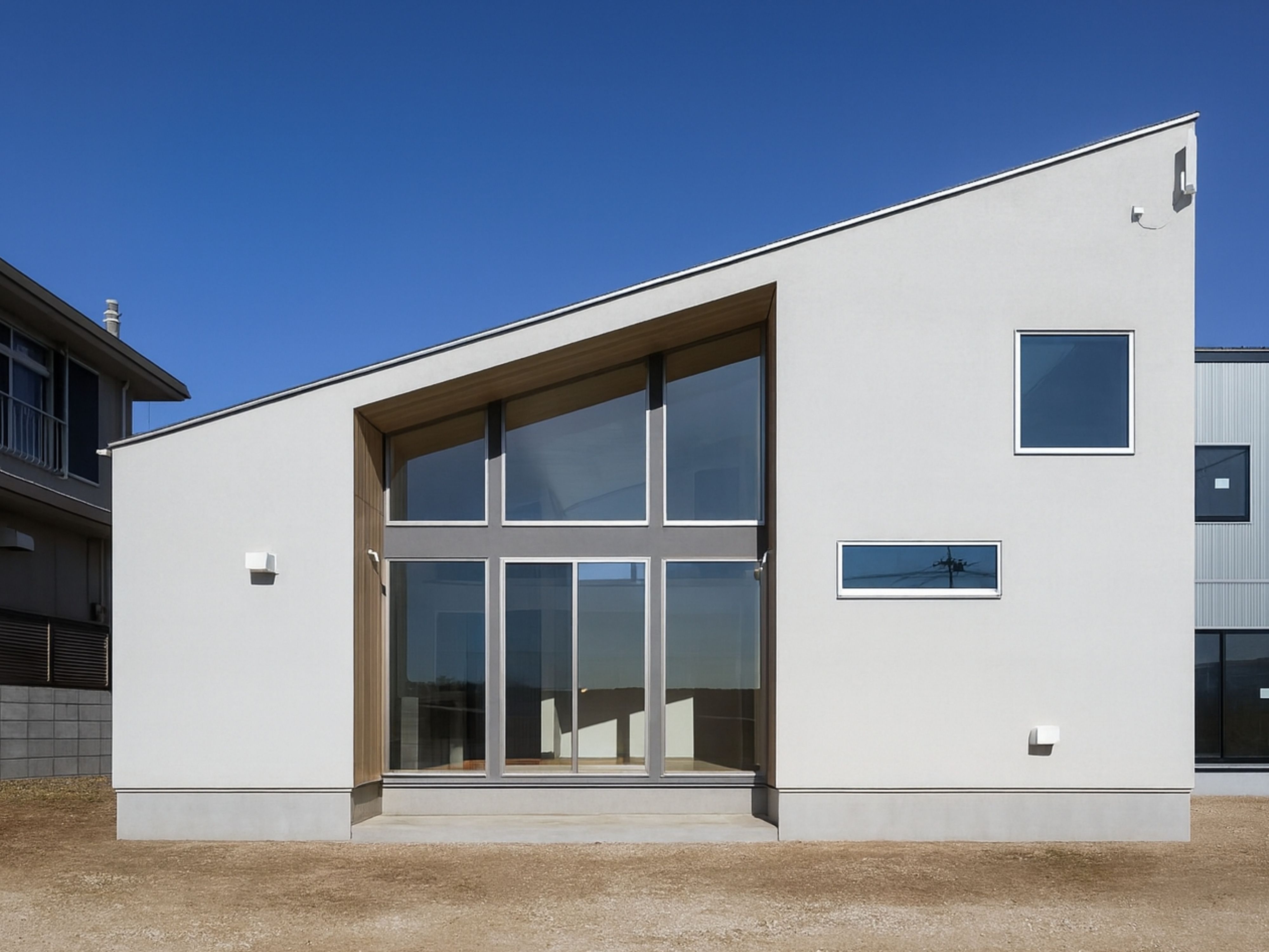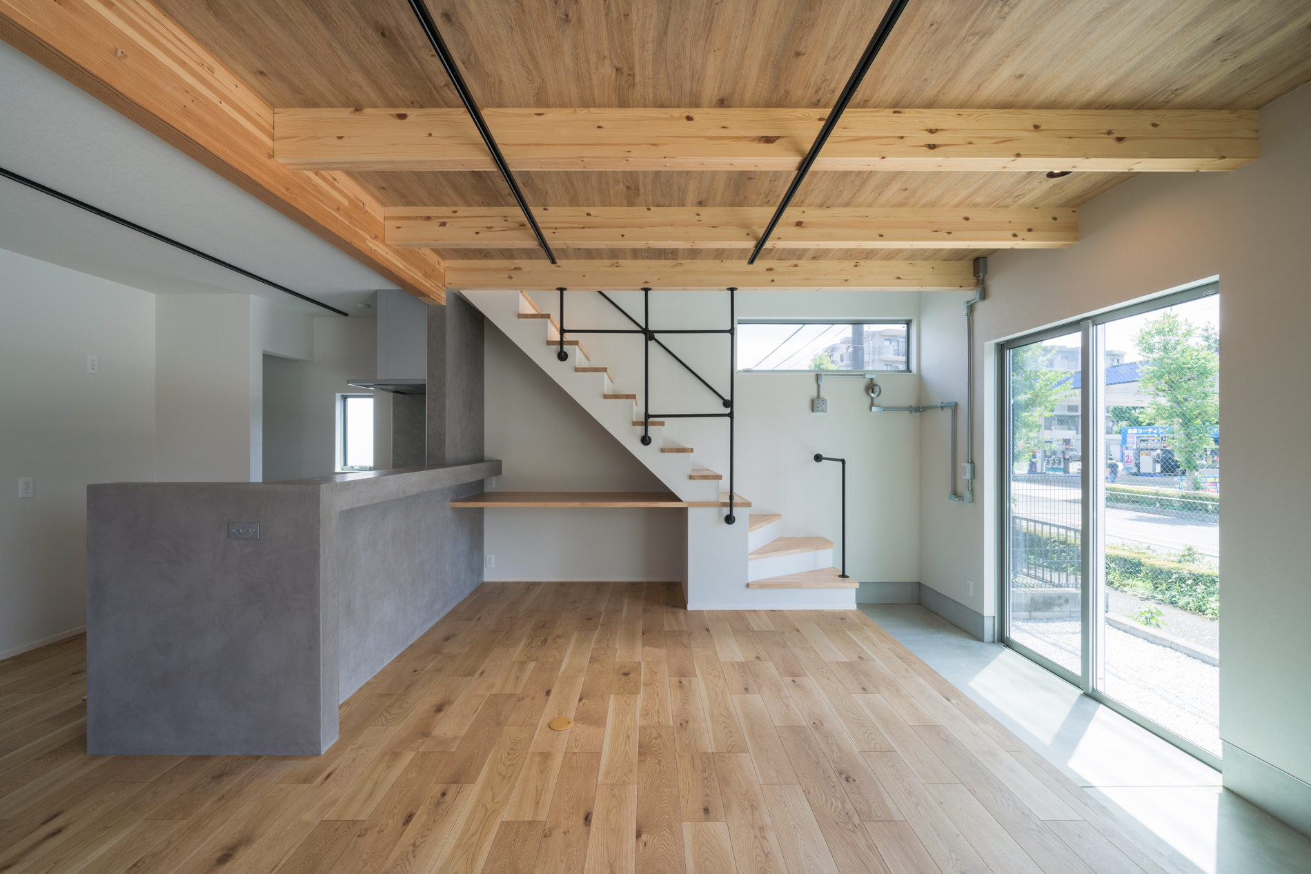 土間と吹抜けで広がる、開放的なモルタル&ウッドハウス