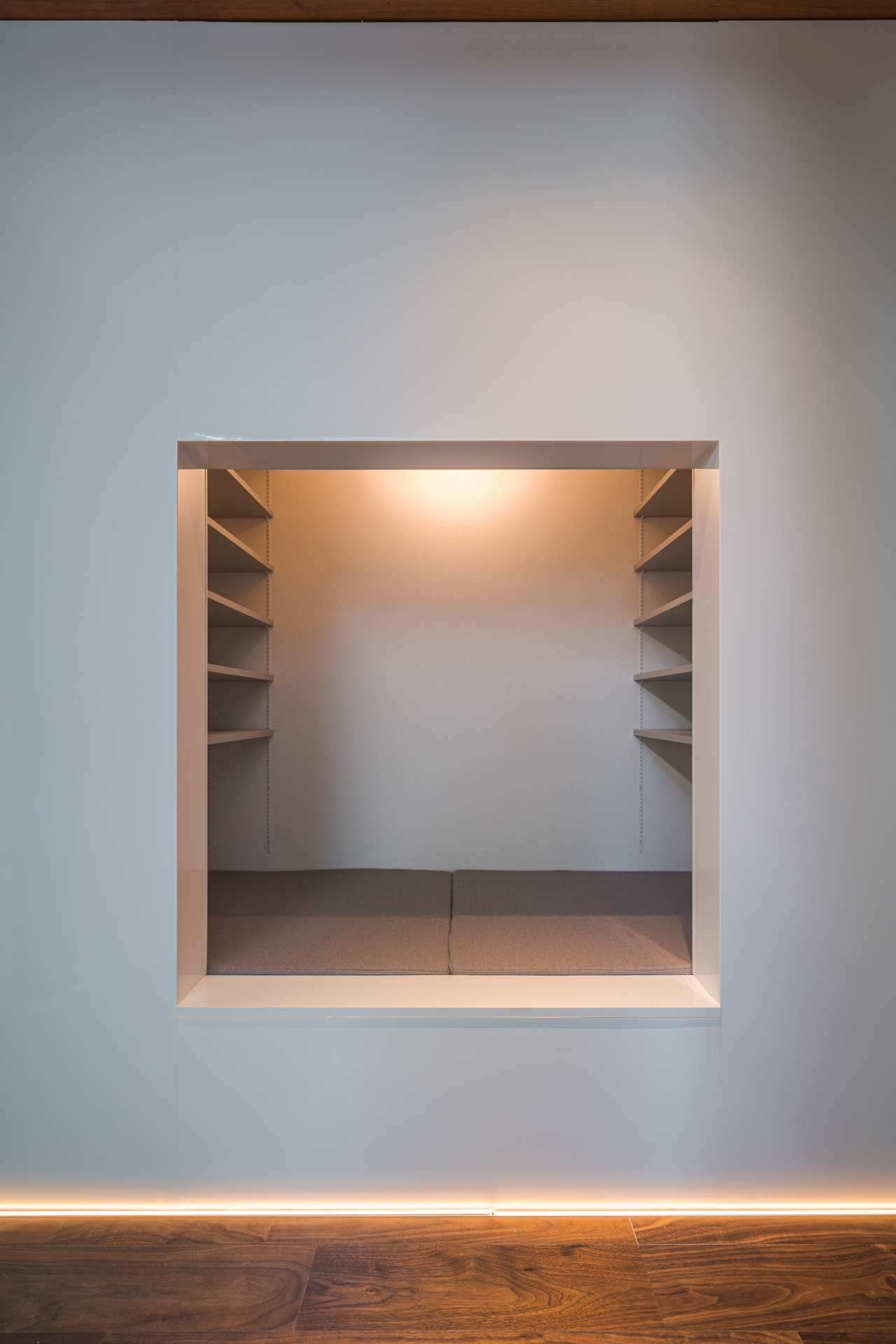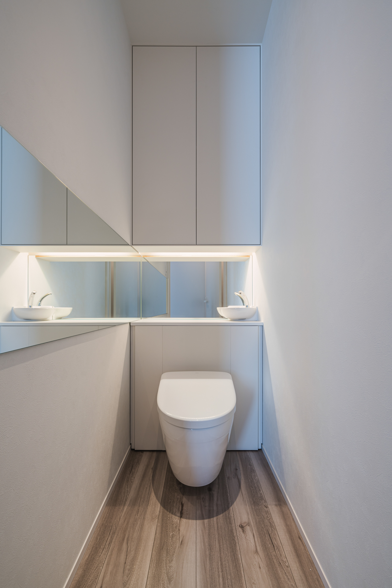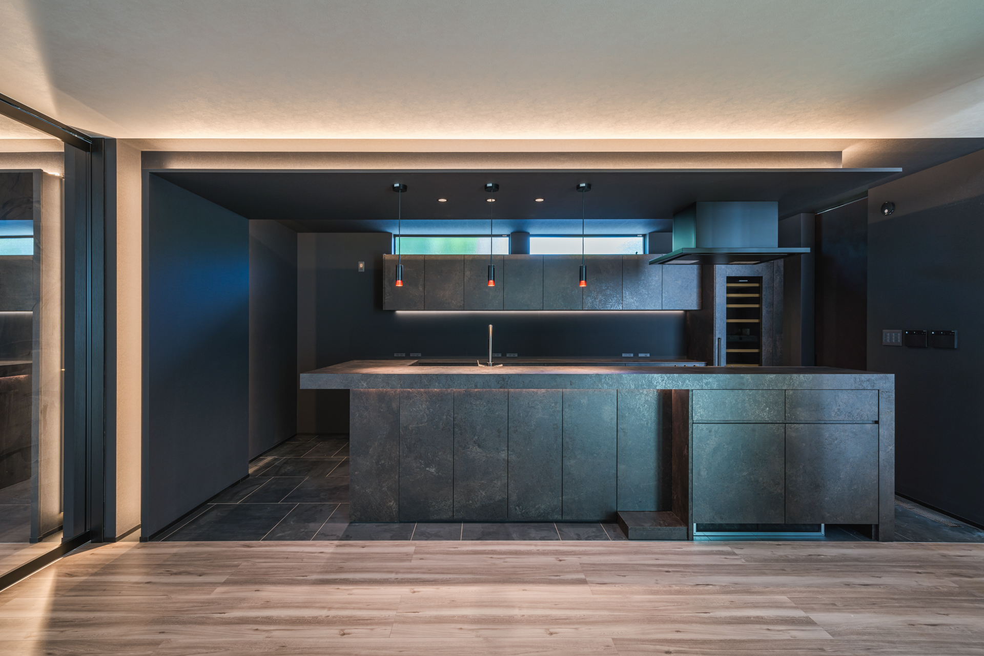 デザインの核となるのは、コントラストと一体感です。リビングの明るさと対比するように、キッチンは、光の演出が際立つモダンでスタイリッシュなダークトーンで設え、生活感を抑えつつ上質なひとときを演出します。