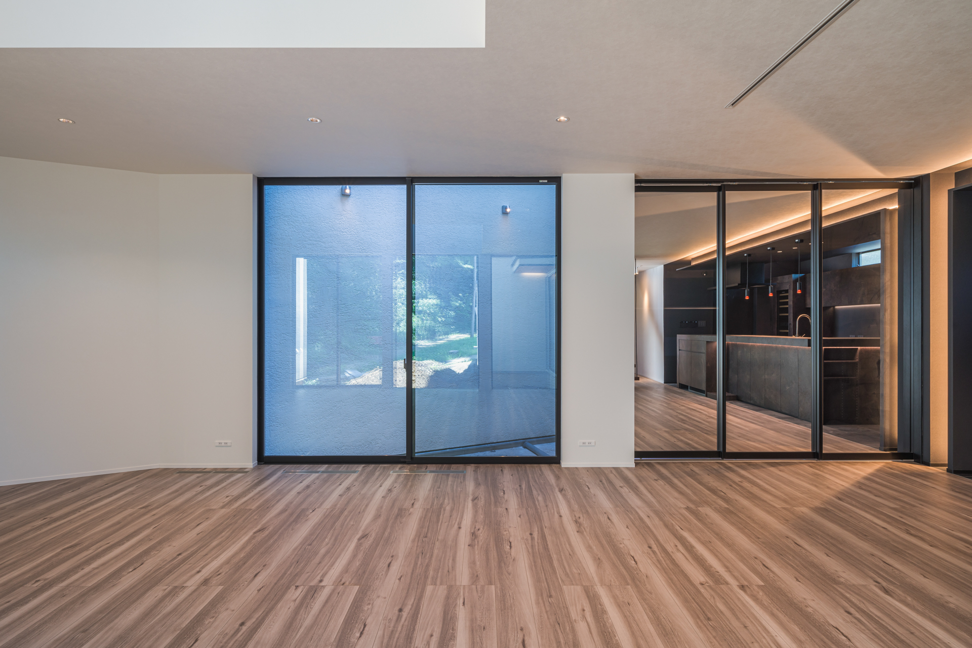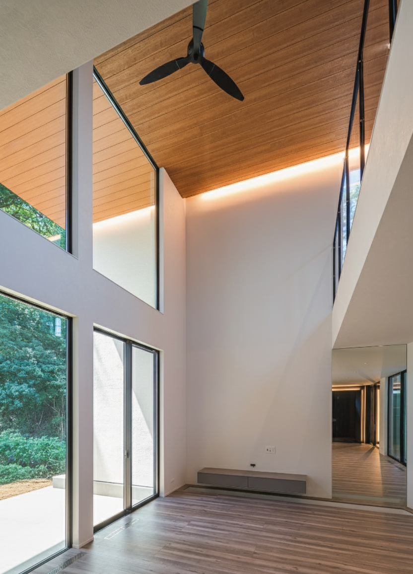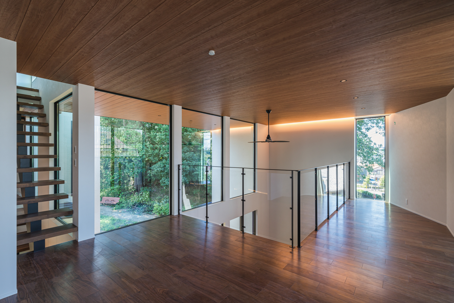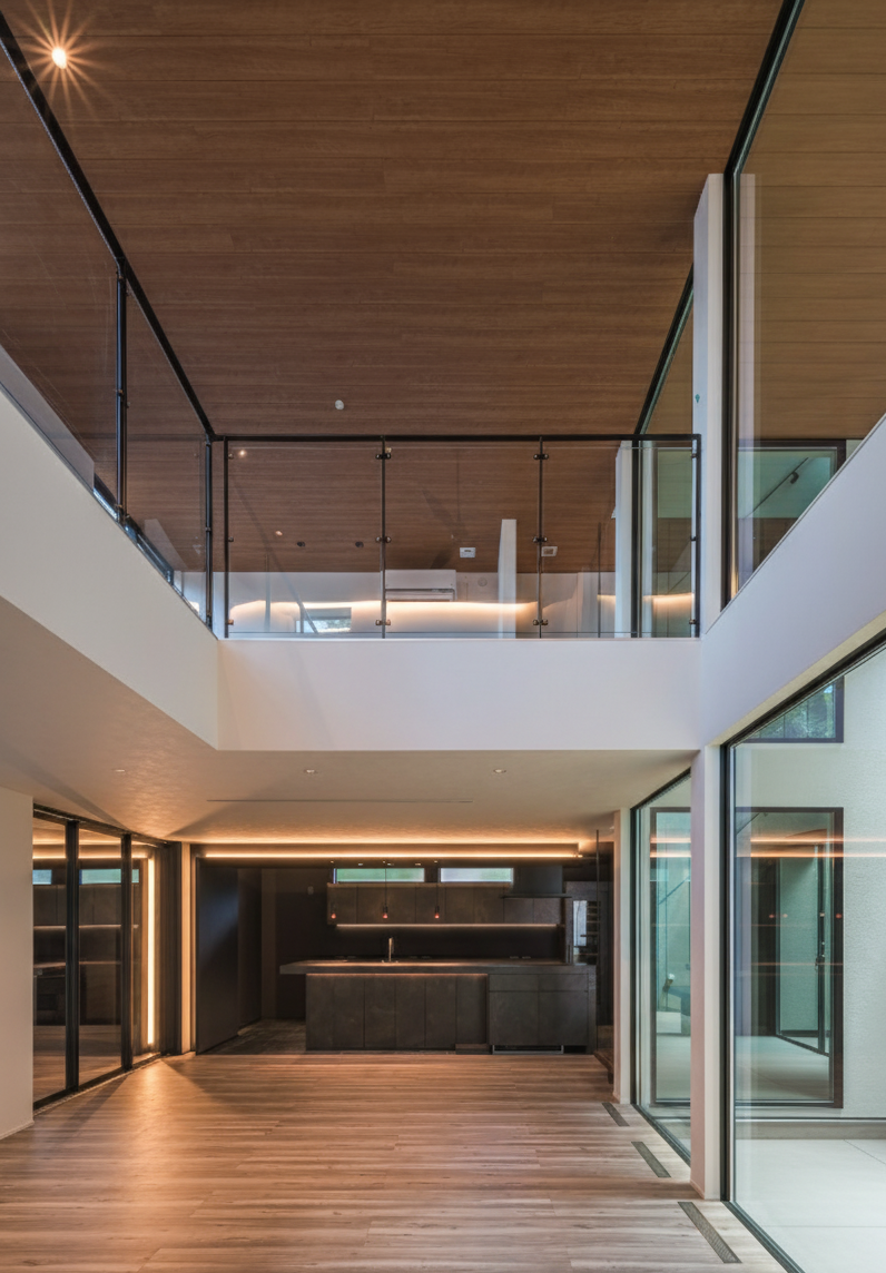 季節の移ろいを肌で感じられる心地よい空間を創り出しています。視線が奥へ、上へと抜ける回遊性のある設計が、実際の面積以上の広がりを感じさせます。