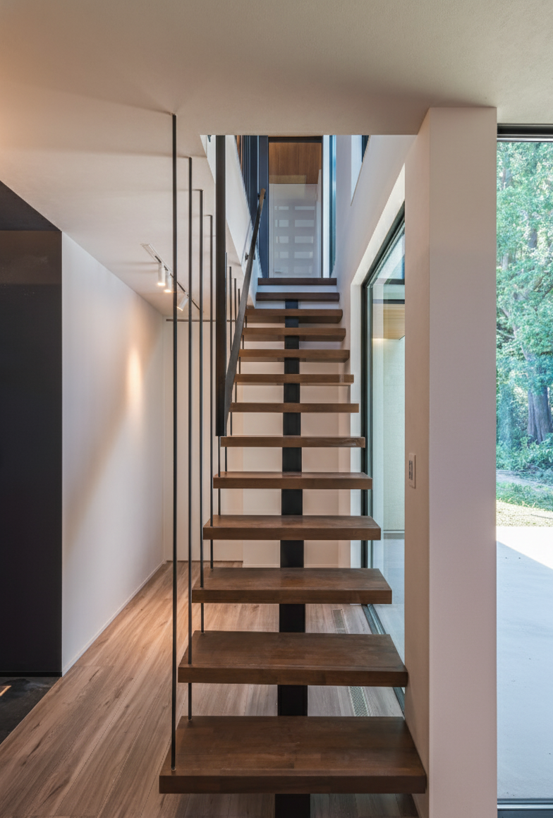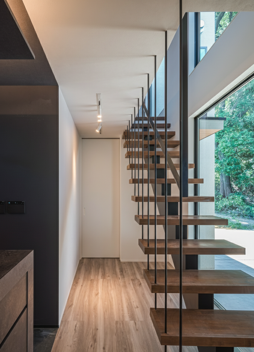 また、細部にまでこだわった素材選びと設計意図が、住まう人の感性を刺激します。エントランスからの緑の切り取り方、浮遊感のある鉄骨階段、そしてプライベート空間の機能美。光、素材、そして自然が織りなす、洗練された住まいをご堪能ください。