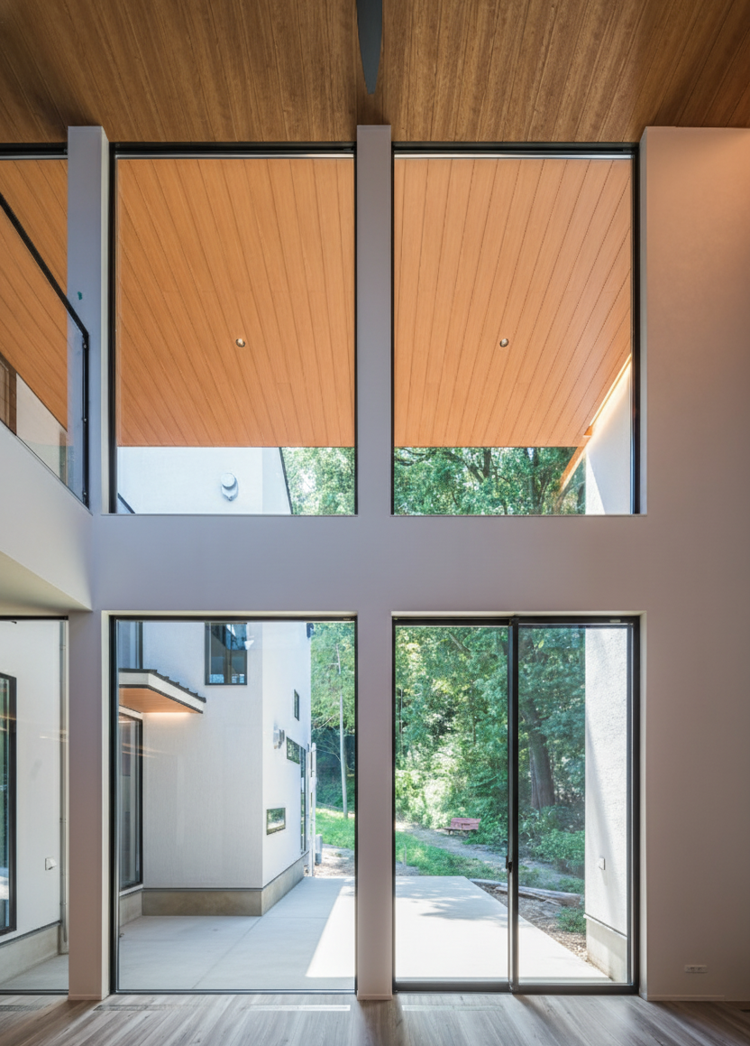 リビングには、2階に届くほどのダイナミックな吹き抜けと大開口窓を採用。天井の木目、白い壁、そして窓の外に広がる緑が、光と共に室内に共鳴し、