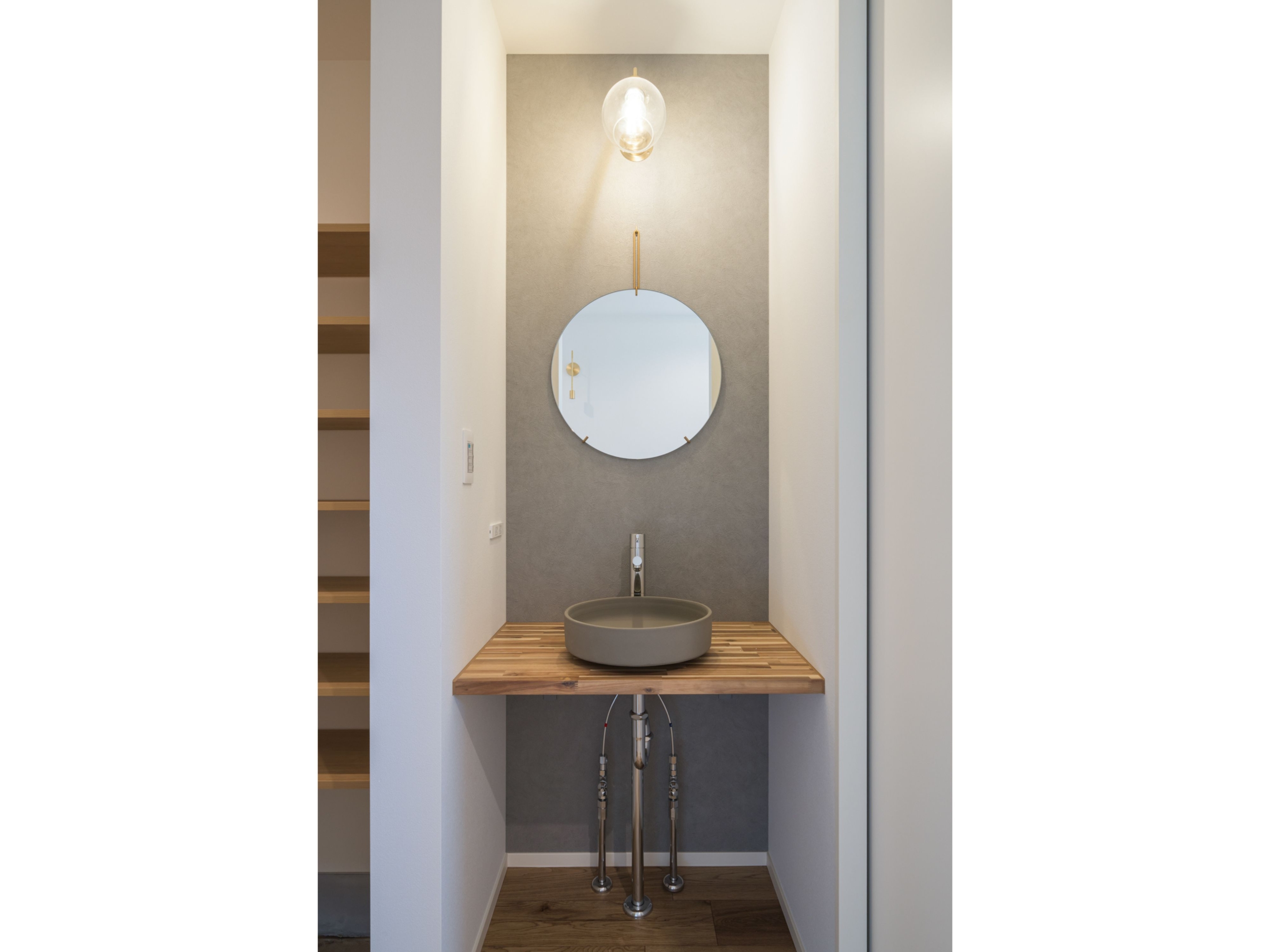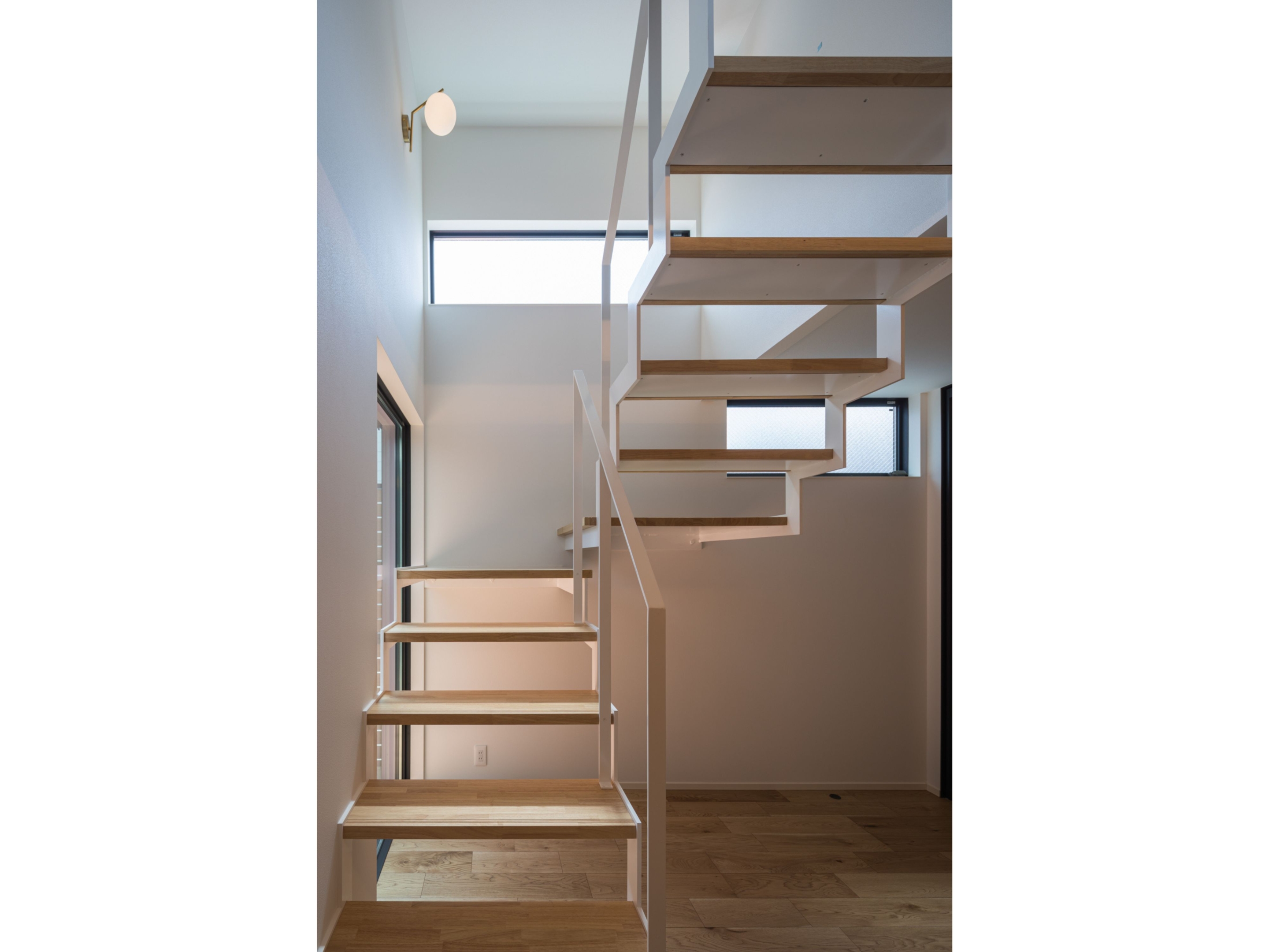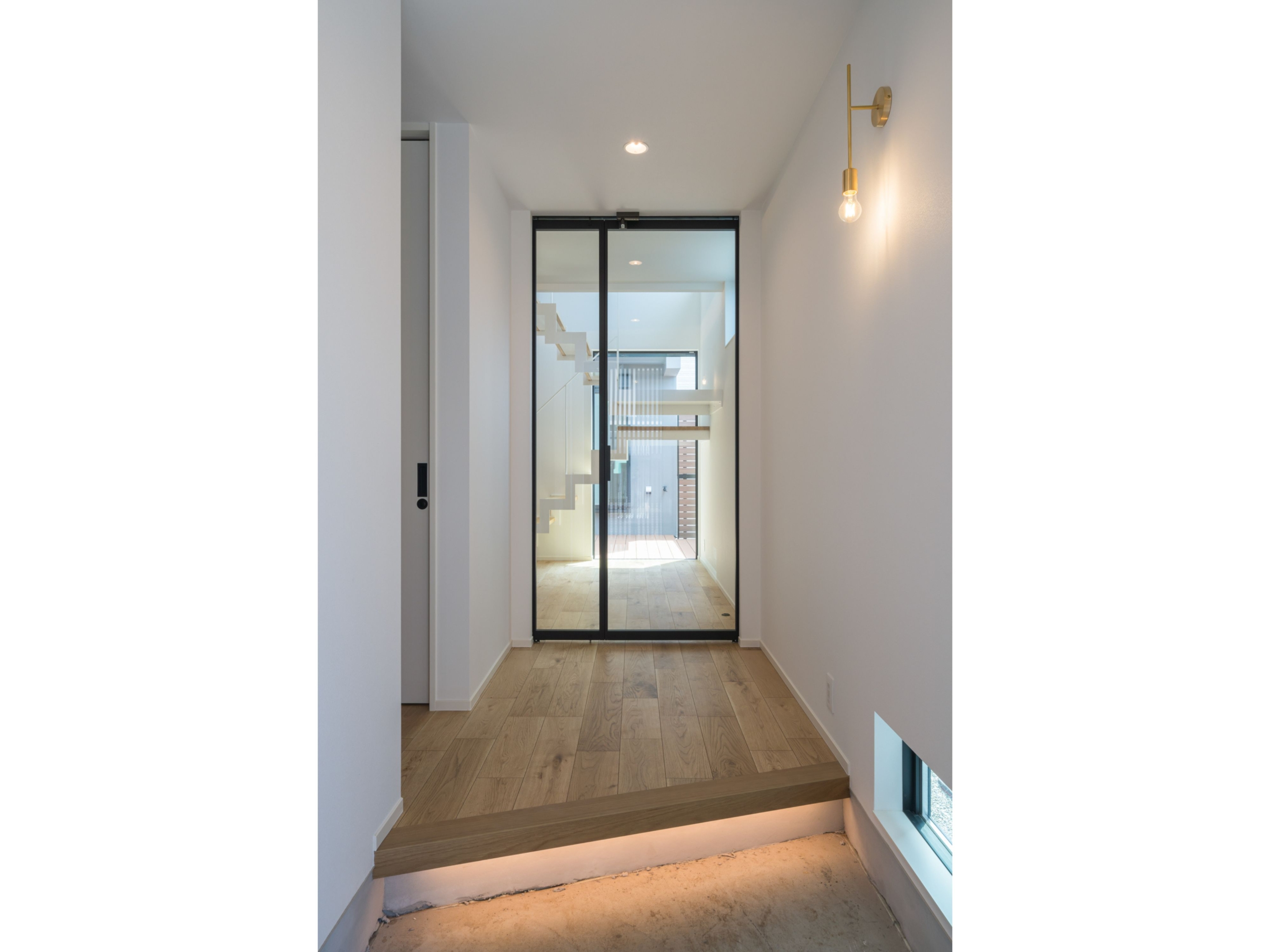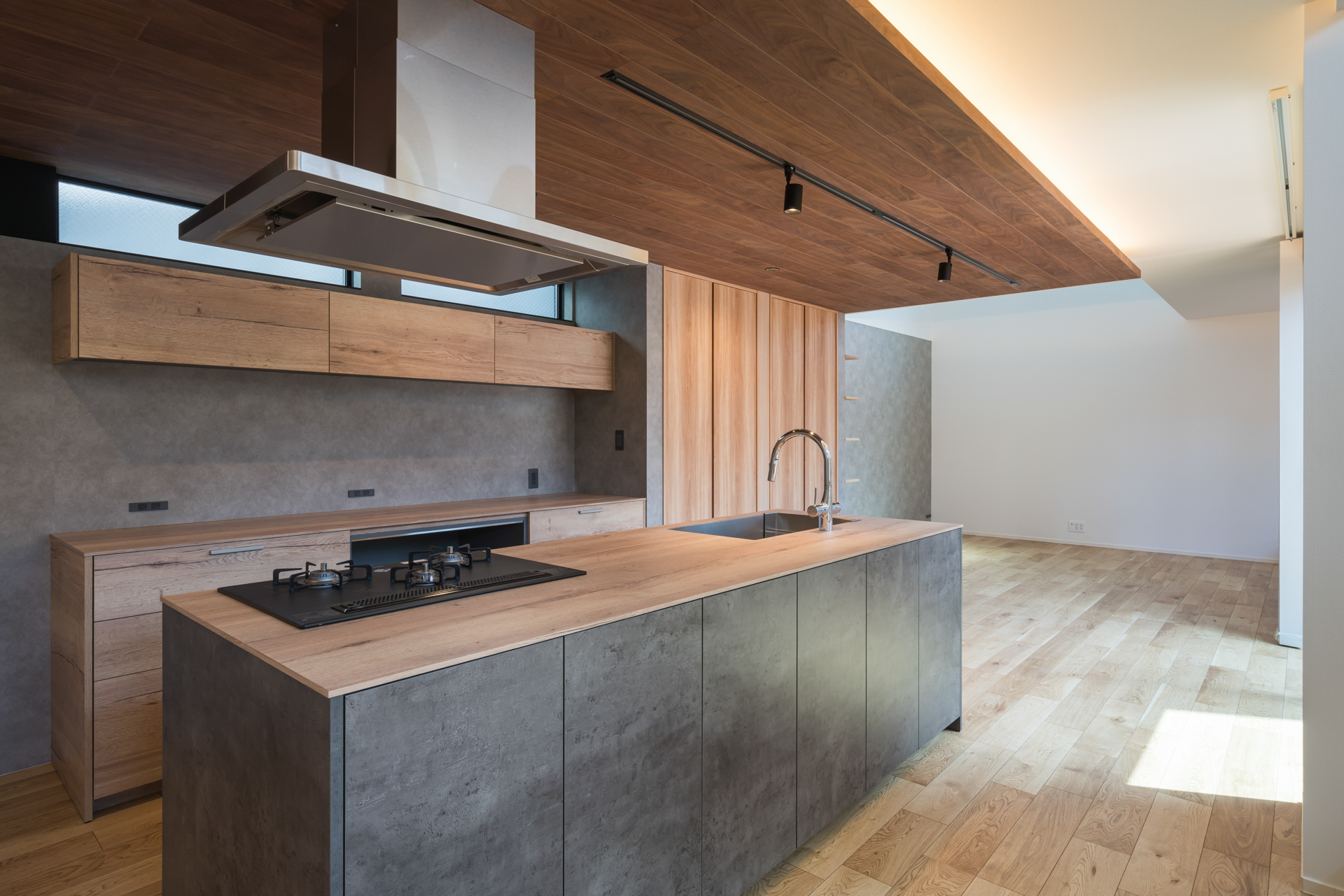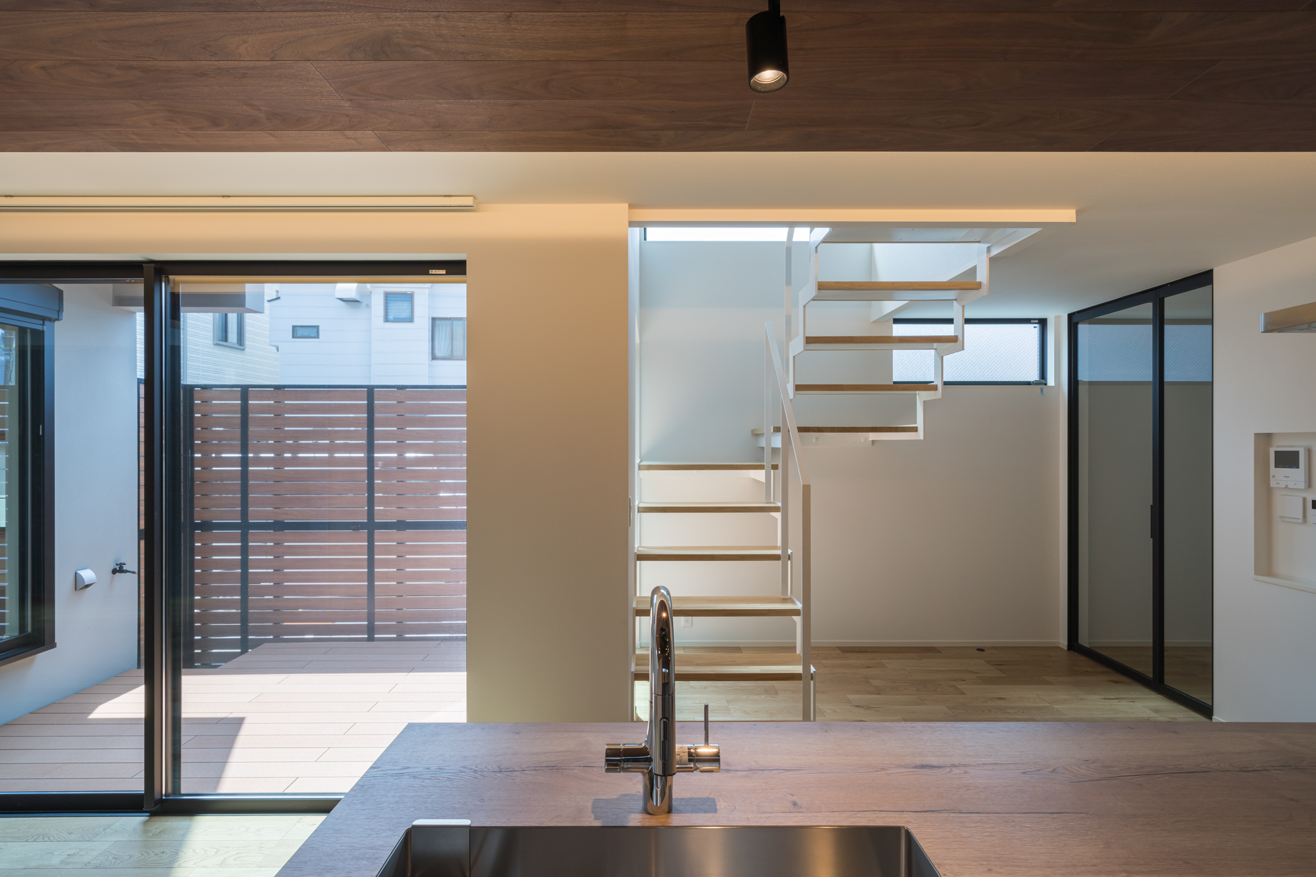 WORKSCASE223 「静けさとぬくもりの家」 吹抜けが創る空間の広がり 立体的な外観デザイン。素材を切り替えた門柱と、横桟のフェンスが、隣地との境界を美しく区切り、プライベートな空間を守ります。 奥のテラスまで視線が抜けるよう、ガラスの建具を採用した開放的な玄関ホール。軽やかなスケルトン階段が視線の先に現れ、空間の広がりを感じさせます。足元には間接照明を仕込み、温かい光でゲストを迎えます。 真鍮のブラケットライト、丸鏡、木のカウンターとモルタル調の壁の組み合わせが、空間を上質に演出します。小さな空間にもデザイン性を追求し、お客様をもてなす意図を込めています。 空間の主役となる、モルタル調のアイランドキッチン。天井には濃色の木質パネル、床には明るい木材を採用し、上下のコントラストで空間に奥行きを与えました。キッチン上部の間接照明は、温かな光で木質パネルの美しさを際立たせる設計です。 リビング上部の吹き抜けと高窓(トップライト)は、都市部で採光が難しい中でも、一日中安定した自然光を取り込むための重要な設計要素です。光の当たらない壁面にはモルタル調のクロスを貼り、間接照明を組み合わせて陰影を美しく見せています。 リビングの一角に設けた小上がりの和室。琉球畳を採用し、モダンな空間に調和するようデザインしました。地窓に設けた障子は、柔らかな光を取り込みながら、外部からの視線をコントロールする役割を担います。 明るい白のフレームと木の踏板で構成されたスケルトン階段。吹き抜け上部のハイサイド窓からの光を階下へ届ける「光の通り道」としての役割も果たします。壁のブラケットライトが空間に温かさを添えます。 遊び心のあるターコイズブルーの壁と斜め天井が特徴のヌック。屋根の形状をそのまま活かし、採光窓を設けることで、秘密基地のような特別感のある居室を実現しました。