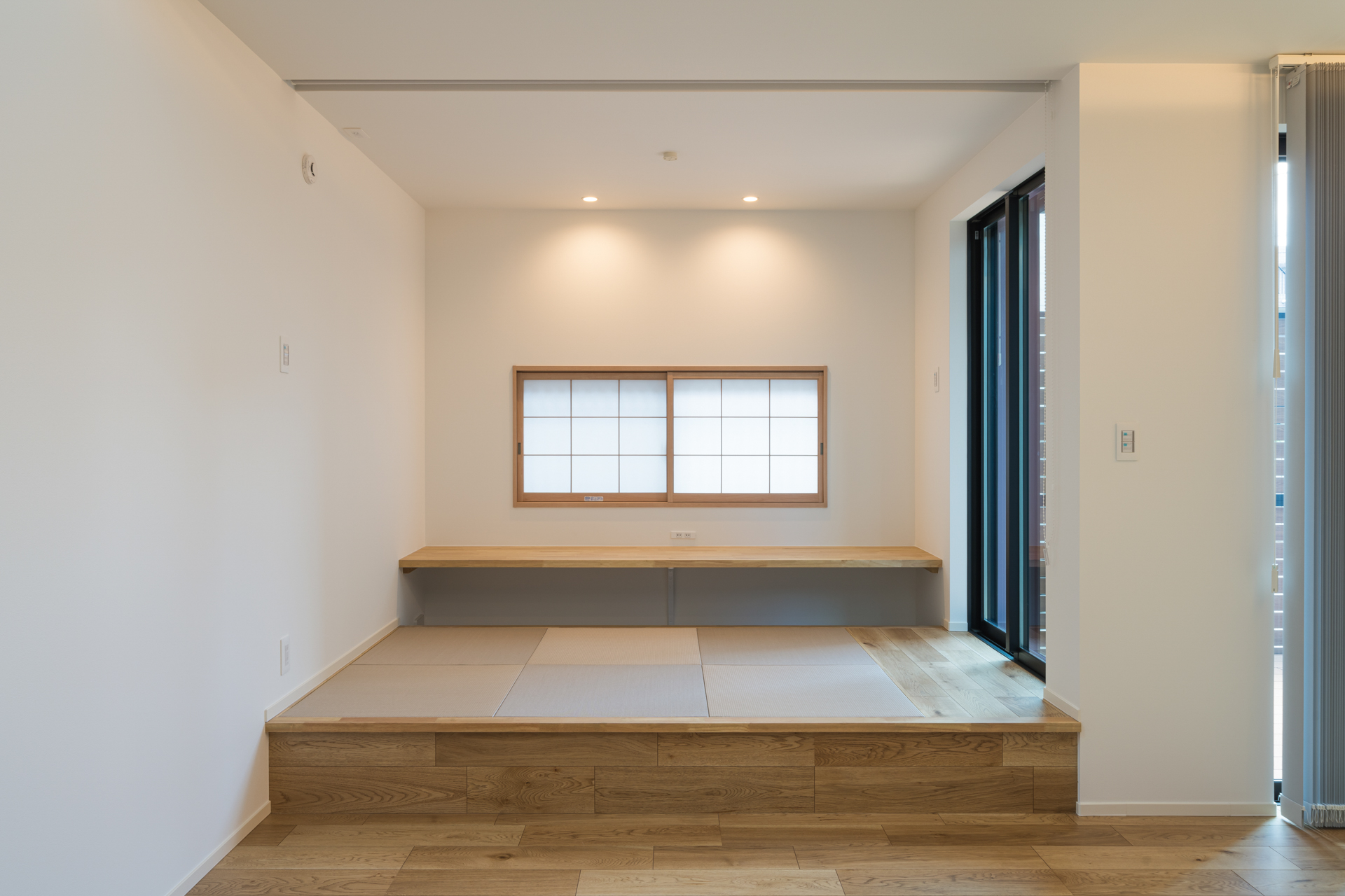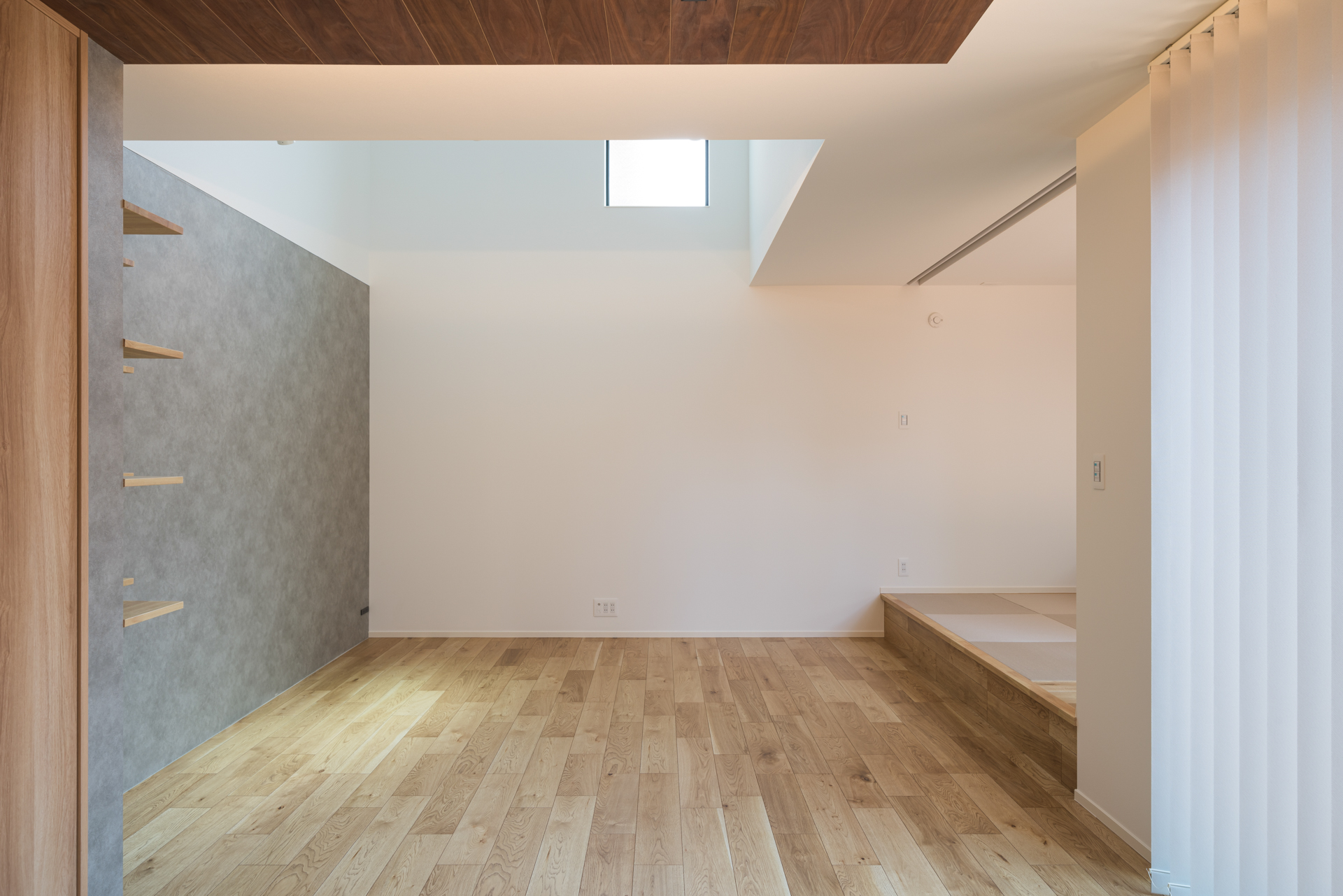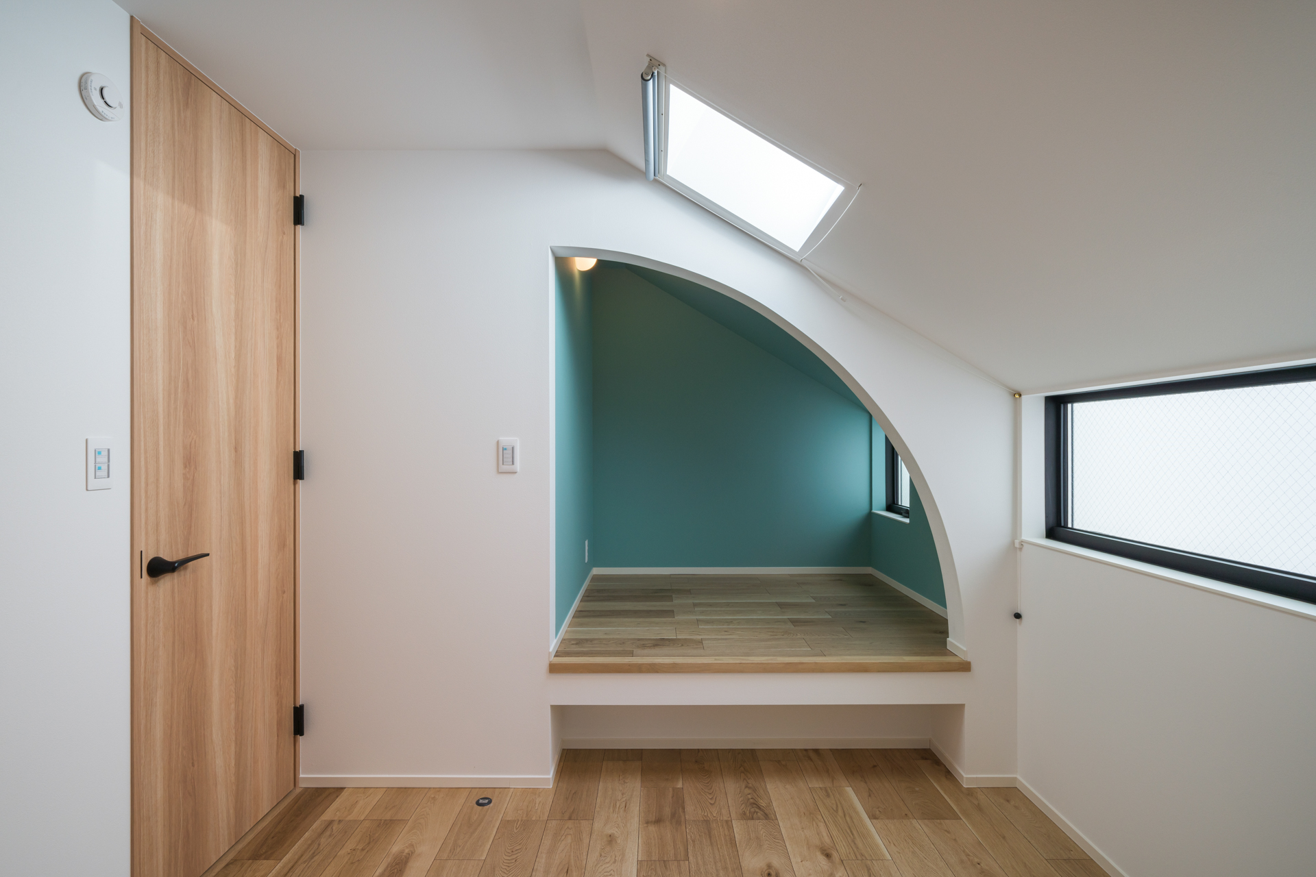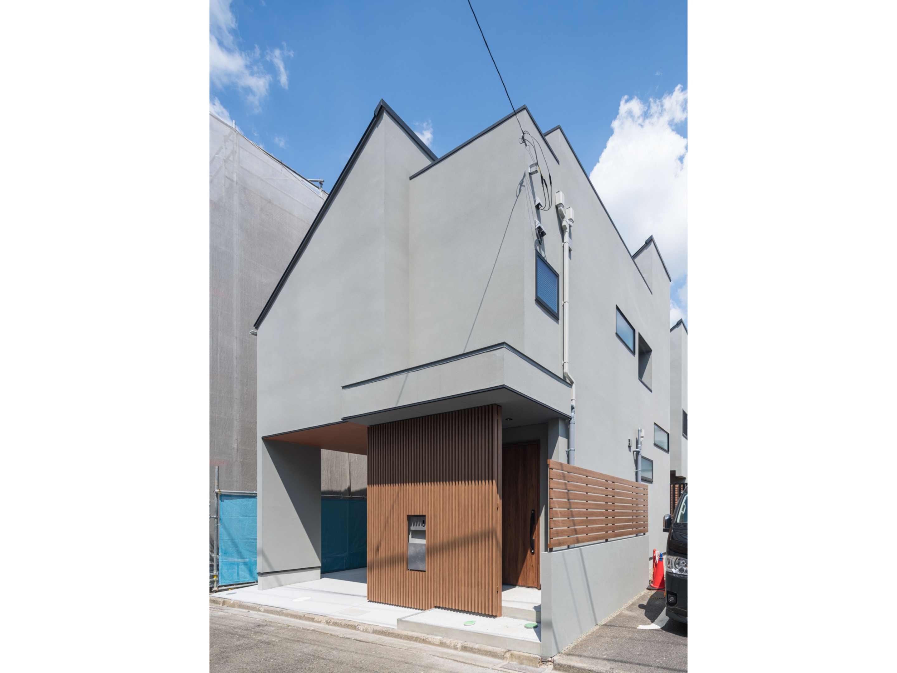 WORKSCASE223 「静けさとぬくもりの家」 吹抜けが創る空間の広がり 立体的な外観デザイン。素材を切り替えた門柱と、横桟のフェンスが、隣地との境界を美しく区切り、プライベートな空間を守ります。 奥のテラスまで視線が抜けるよう、ガラスの建具を採用した開放的な玄関ホール。軽やかなスケルトン階段が視線の先に現れ、空間の広がりを感じさせます。足元には間接照明を仕込み、温かい光でゲストを迎えます。 真鍮のブラケットライト、丸鏡、木のカウンターとモルタル調の壁の組み合わせが、空間を上質に演出します。小さな空間にもデザイン性を追求し、お客様をもてなす意図を込めています。 空間の主役となる、モルタル調のアイランドキッチン。天井には濃色の木質パネル、床には明るい木材を採用し、上下のコントラストで空間に奥行きを与えました。キッチン上部の間接照明は、温かな光で木質パネルの美しさを際立たせる設計です。 リビング上部の吹き抜けと高窓(トップライト)は、都市部で採光が難しい中でも、一日中安定した自然光を取り込むための重要な設計要素です。光の当たらない壁面にはモルタル調のクロスを貼り、間接照明を組み合わせて陰影を美しく見せています。 リビングの一角に設けた小上がりの和室。琉球畳を採用し、モダンな空間に調和するようデザインしました。地窓に設けた障子は、柔らかな光を取り込みながら、外部からの視線をコントロールする役割を担います。 明るい白のフレームと木の踏板で構成されたスケルトン階段。吹き抜け上部のハイサイド窓からの光を階下へ届ける「光の通り道」としての役割も果たします。壁のブラケットライトが空間に温かさを添えます。 遊び心のあるターコイズブルーの壁と斜め天井が特徴のヌック。屋根の形状をそのまま活かし、採光窓を設けることで、秘密基地のような特別感のある居室を実現しました。