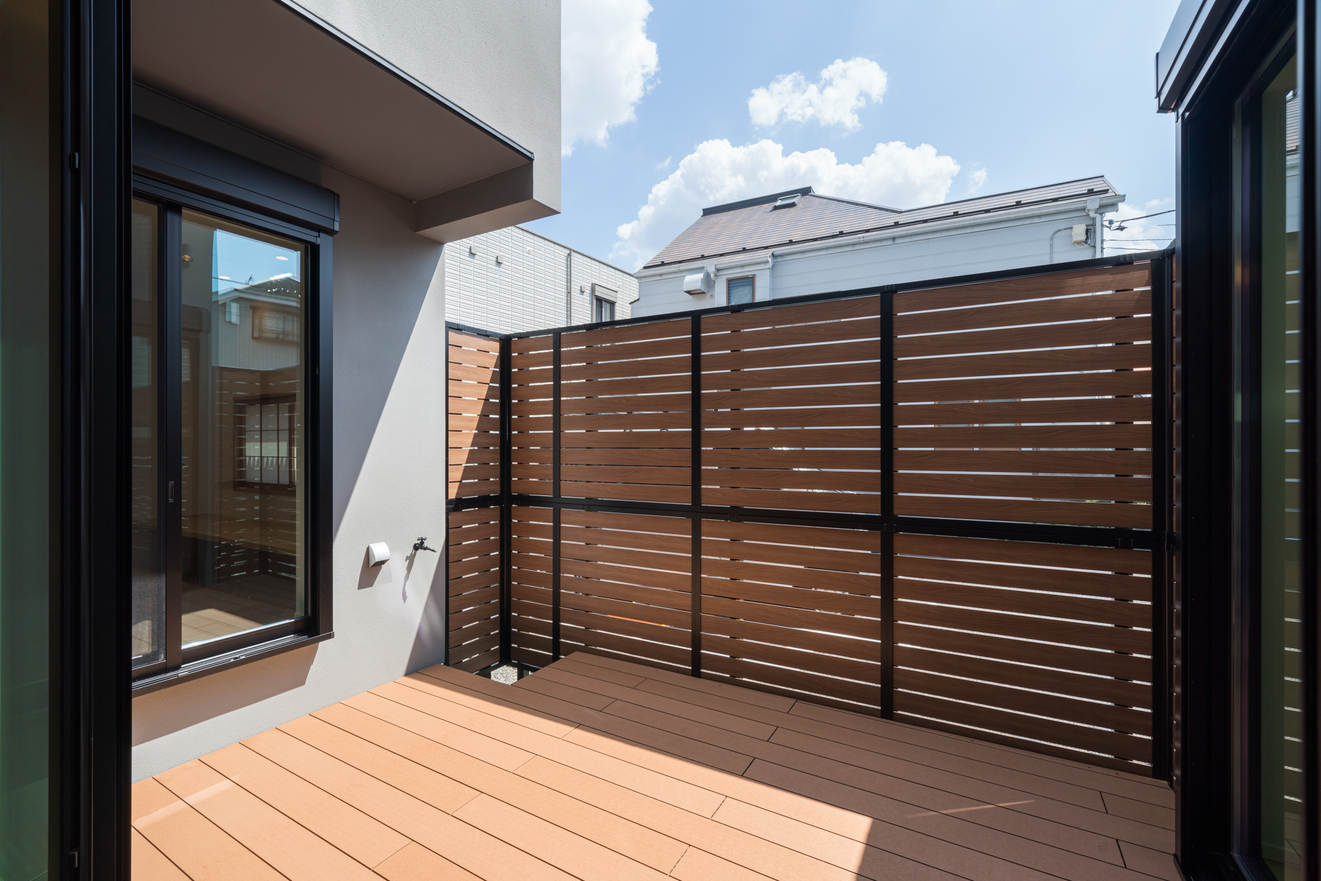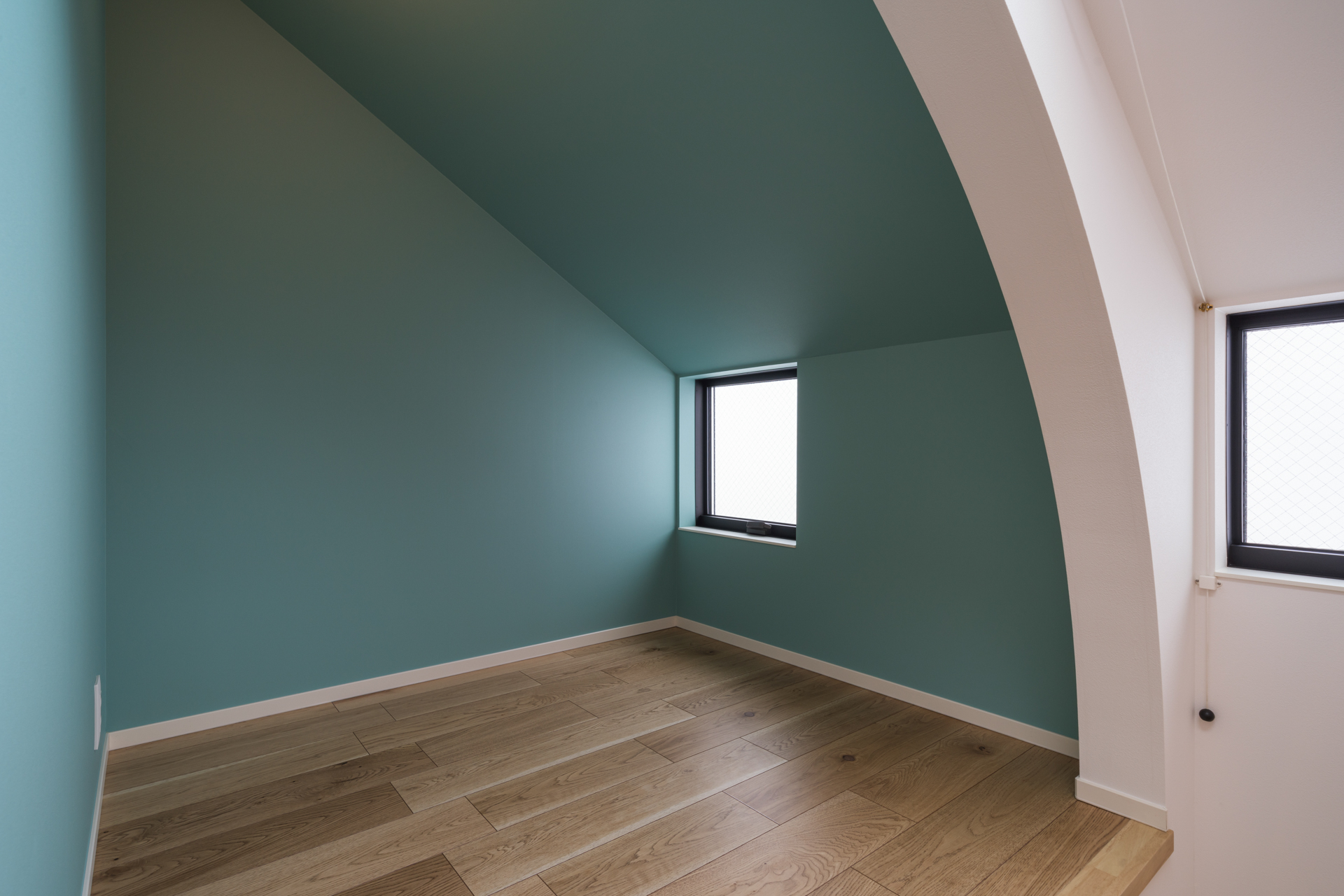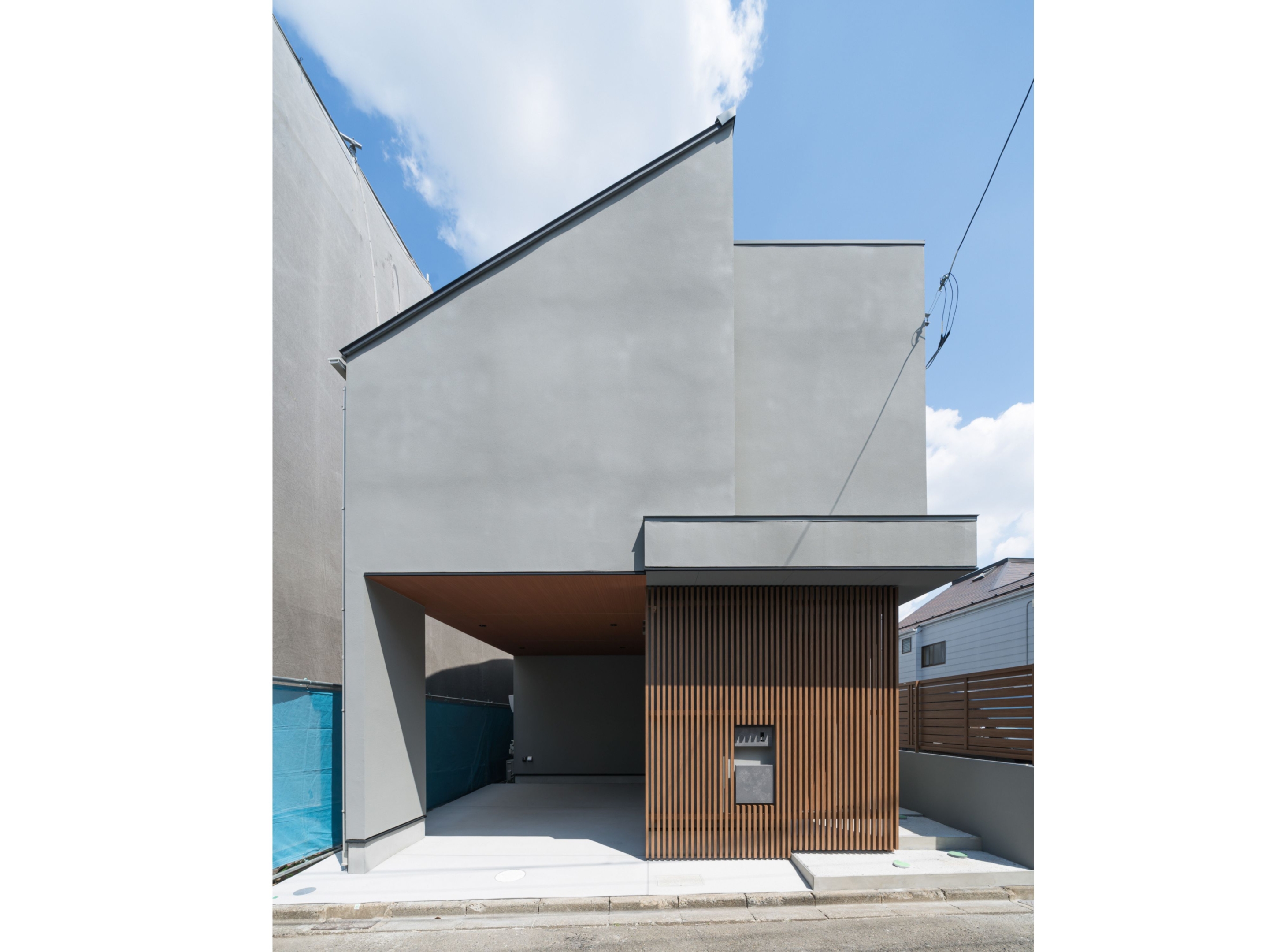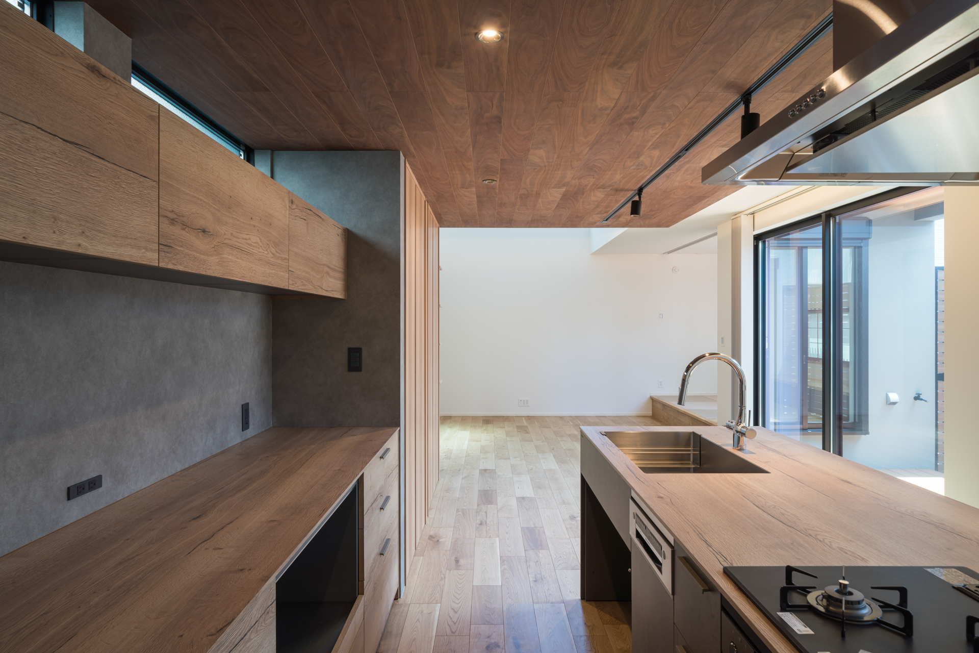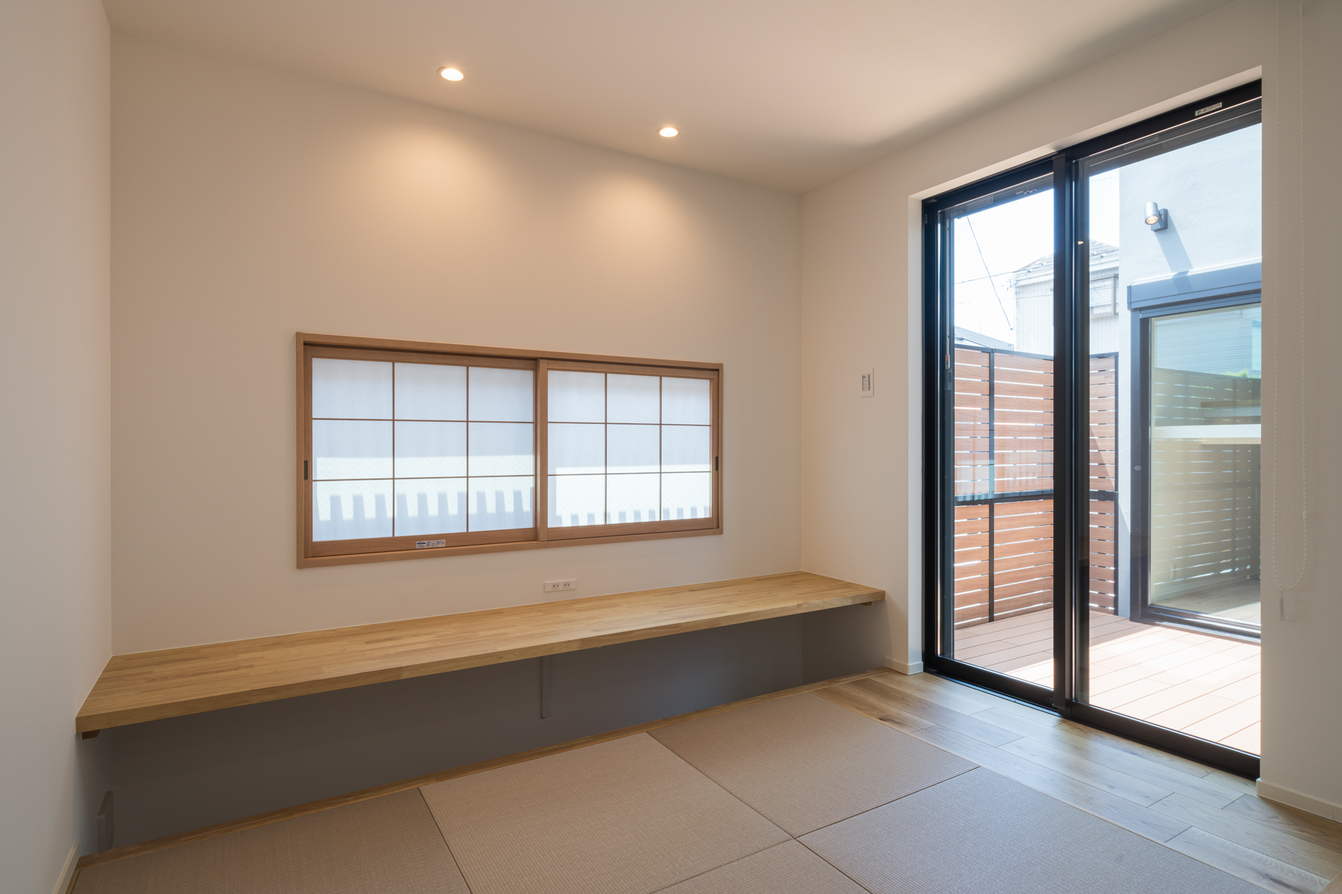 WORKSCASE223 「静けさとぬくもりの家」 吹抜けが創る空間の広がり 立体的な外観デザイン。素材を切り替えた門柱と、横桟のフェンスが、隣地との境界を美しく区切り、プライベートな空間を守ります。 奥のテラスまで視線が抜けるよう、ガラスの建具を採用した開放的な玄関ホール。軽やかなスケルトン階段が視線の先に現れ、空間の広がりを感じさせます。足元には間接照明を仕込み、温かい光でゲストを迎えます。 真鍮のブラケットライト、丸鏡、木のカウンターとモルタル調の壁の組み合わせが、空間を上質に演出します。小さな空間にもデザイン性を追求し、お客様をもてなす意図を込めています。 空間の主役となる、モルタル調のアイランドキッチン。天井には濃色の木質パネル、床には明るい木材を採用し、上下のコントラストで空間に奥行きを与えました。キッチン上部の間接照明は、温かな光で木質パネルの美しさを際立たせる設計です。 リビング上部の吹き抜けと高窓(トップライト)は、都市部で採光が難しい中でも、一日中安定した自然光を取り込むための重要な設計要素です。光の当たらない壁面にはモルタル調のクロスを貼り、間接照明を組み合わせて陰影を美しく見せています。 リビングの一角に設けた小上がりの和室。琉球畳を採用し、モダンな空間に調和するようデザインしました。地窓に設けた障子は、柔らかな光を取り込みながら、外部からの視線をコントロールする役割を担います。 明るい白のフレームと木の踏板で構成されたスケルトン階段。吹き抜け上部のハイサイド窓からの光を階下へ届ける「光の通り道」としての役割も果たします。壁のブラケットライトが空間に温かさを添えます。 遊び心のあるターコイズブルーの壁と斜め天井が特徴のヌック。屋根の形状をそのまま活かし、採光窓を設けることで、秘密基地のような特別感のある居室を実現しました。