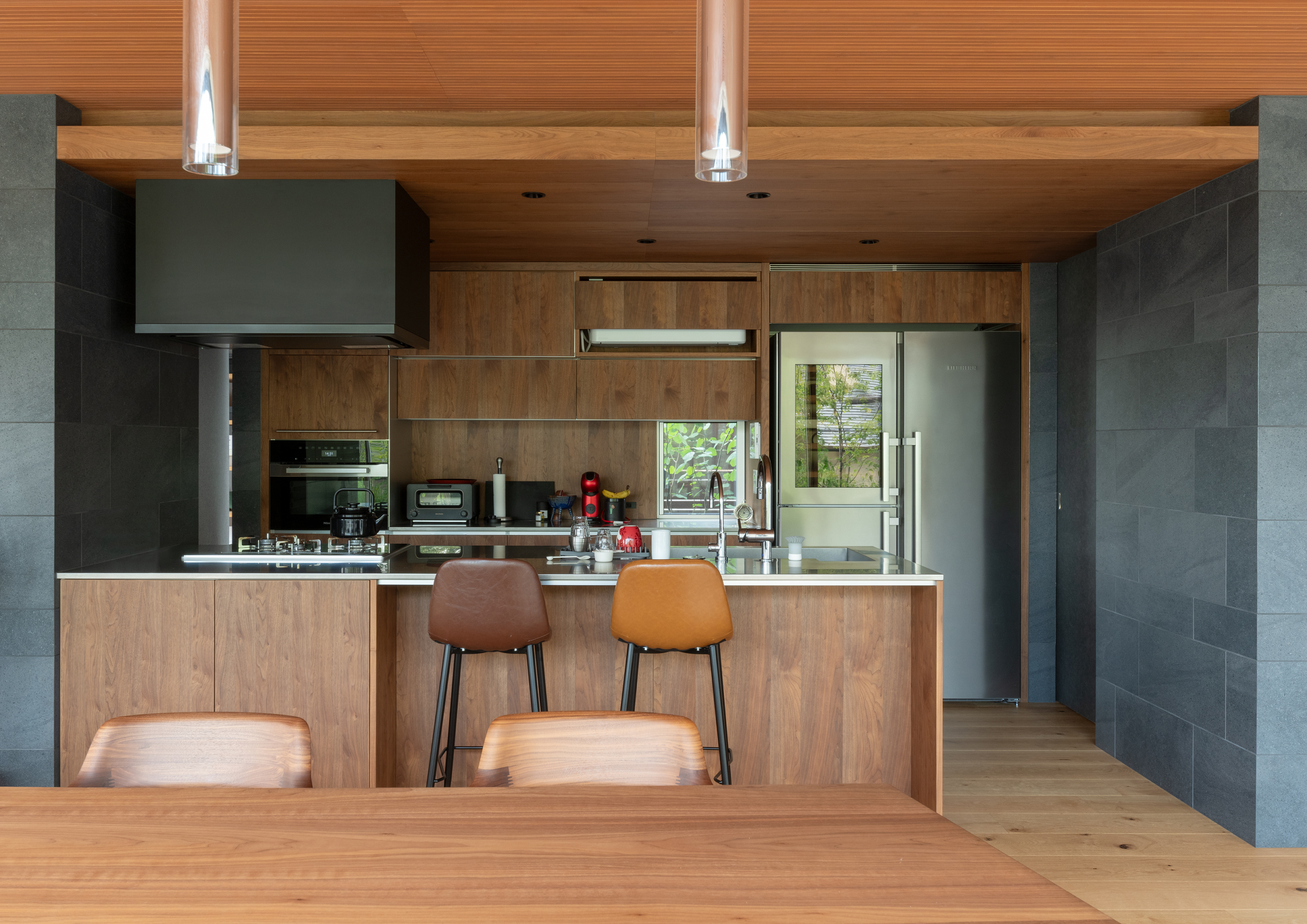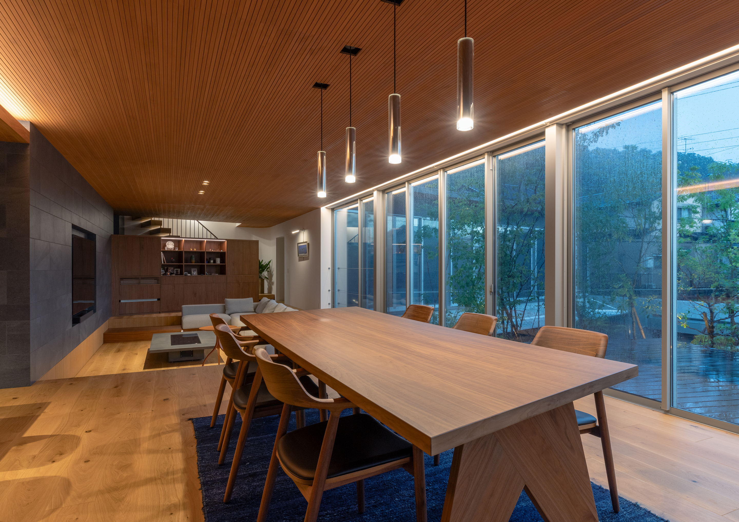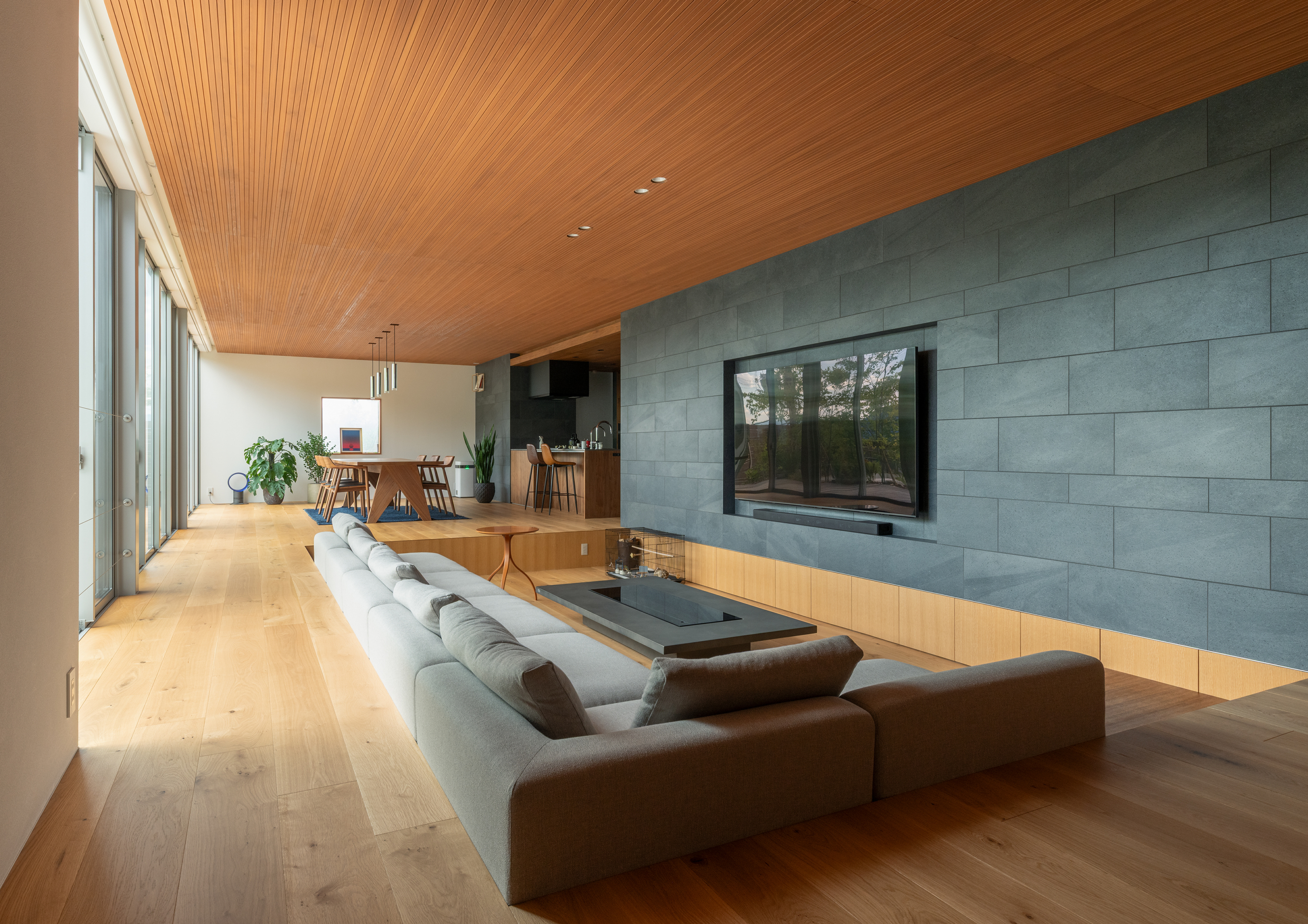 LDKは視線の抜けと天井高の変化でゆるやかにゾーニング。素材はオークとスレートを基調とし、上質で落ち着きある空間を形成しています。