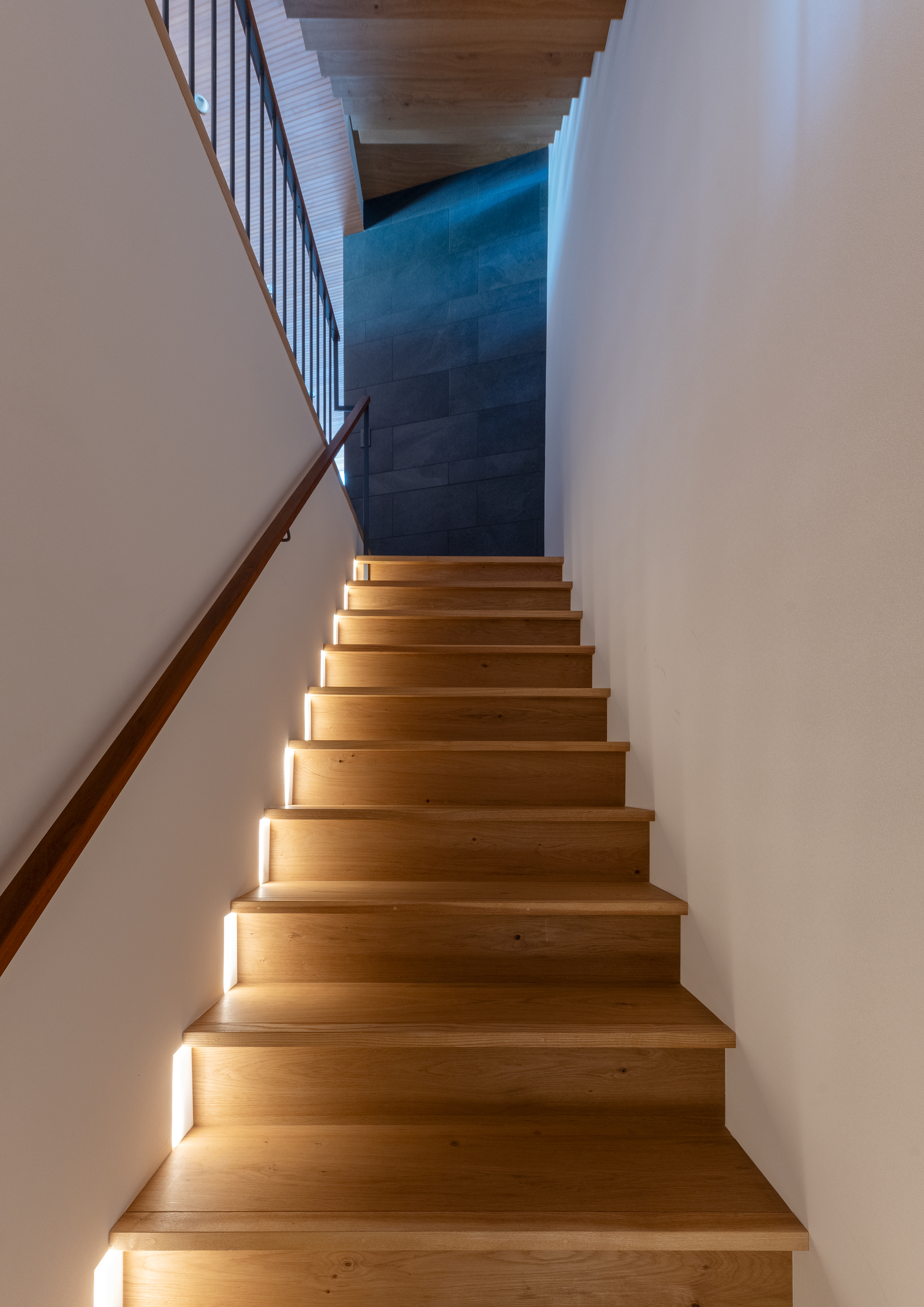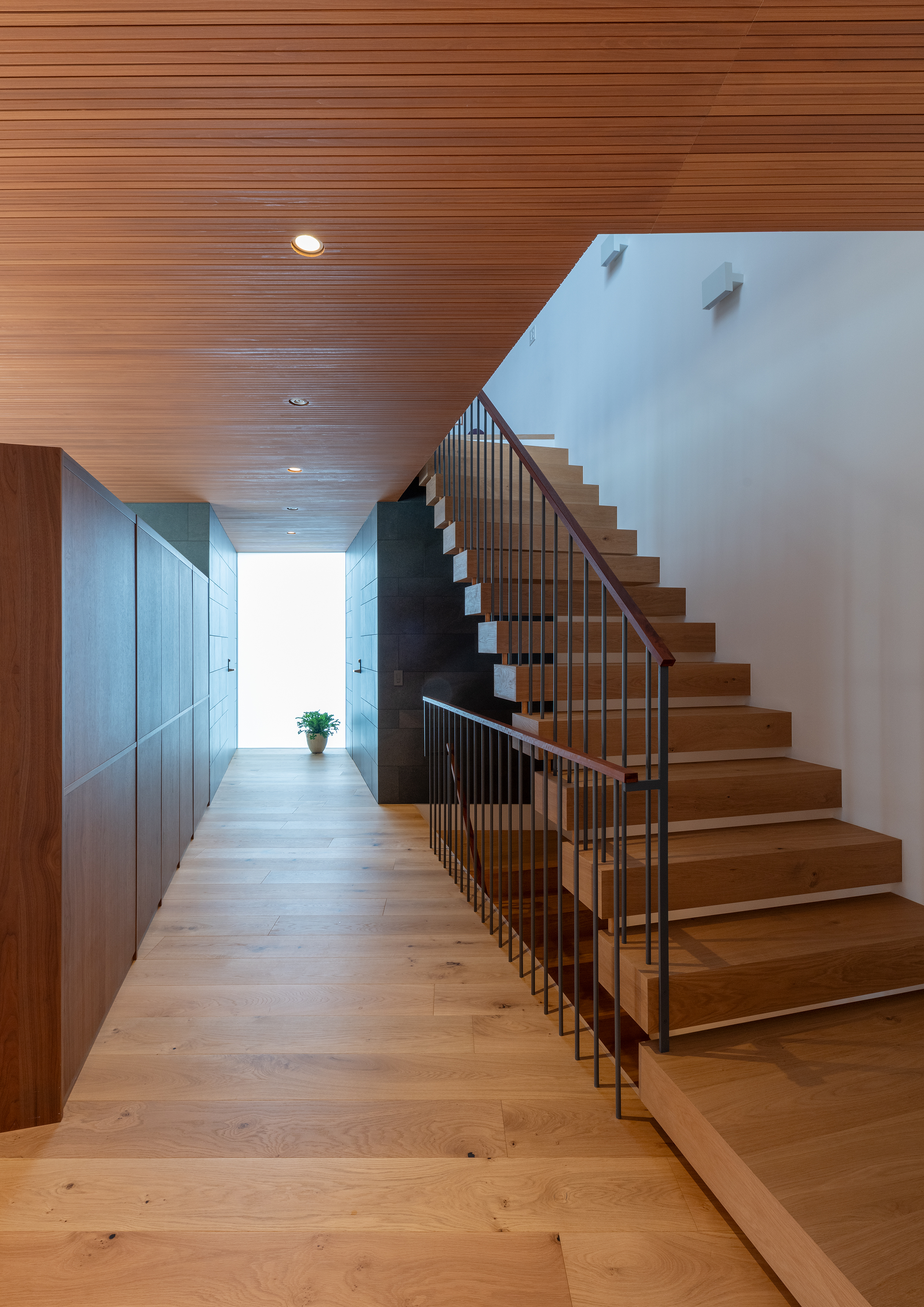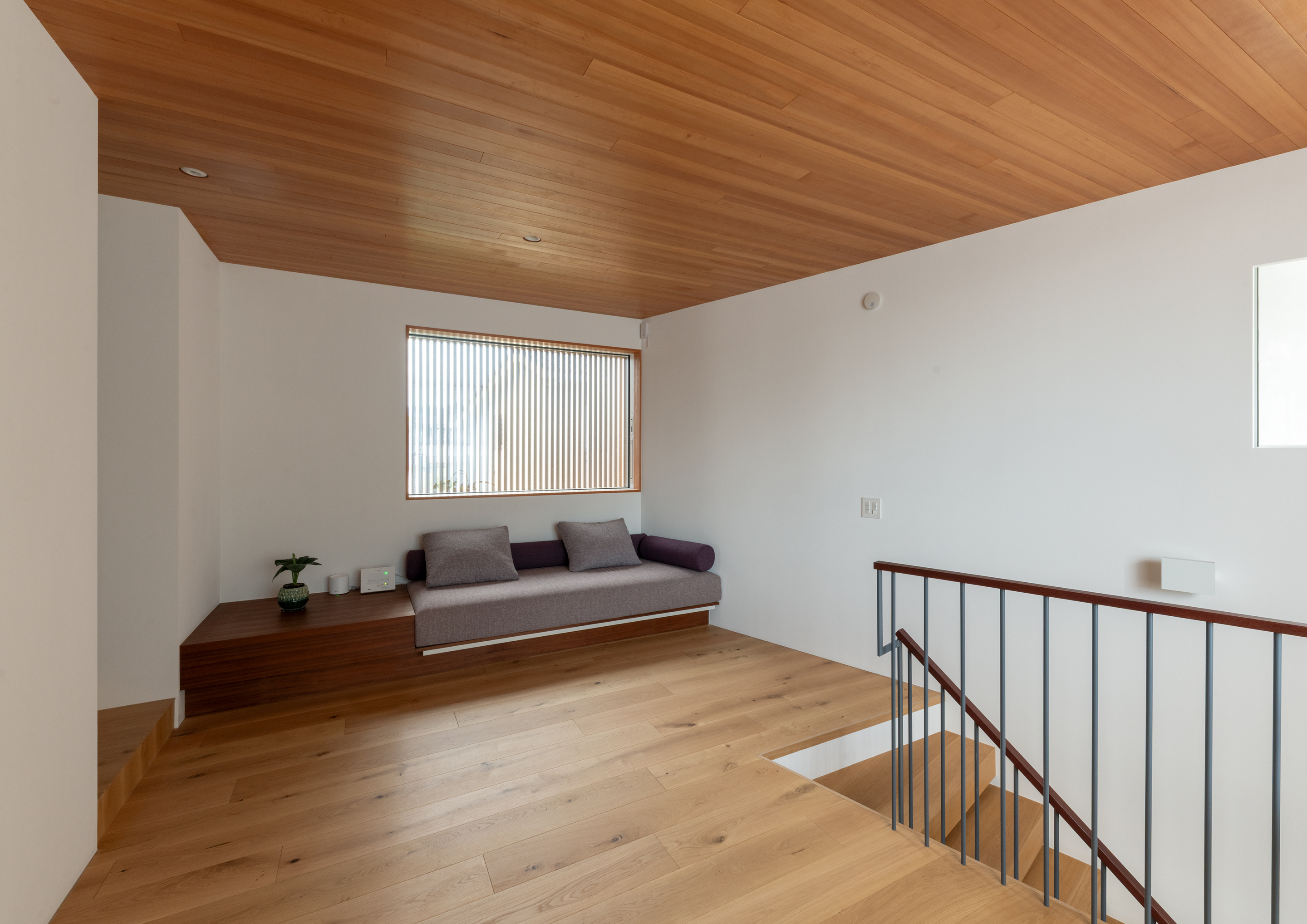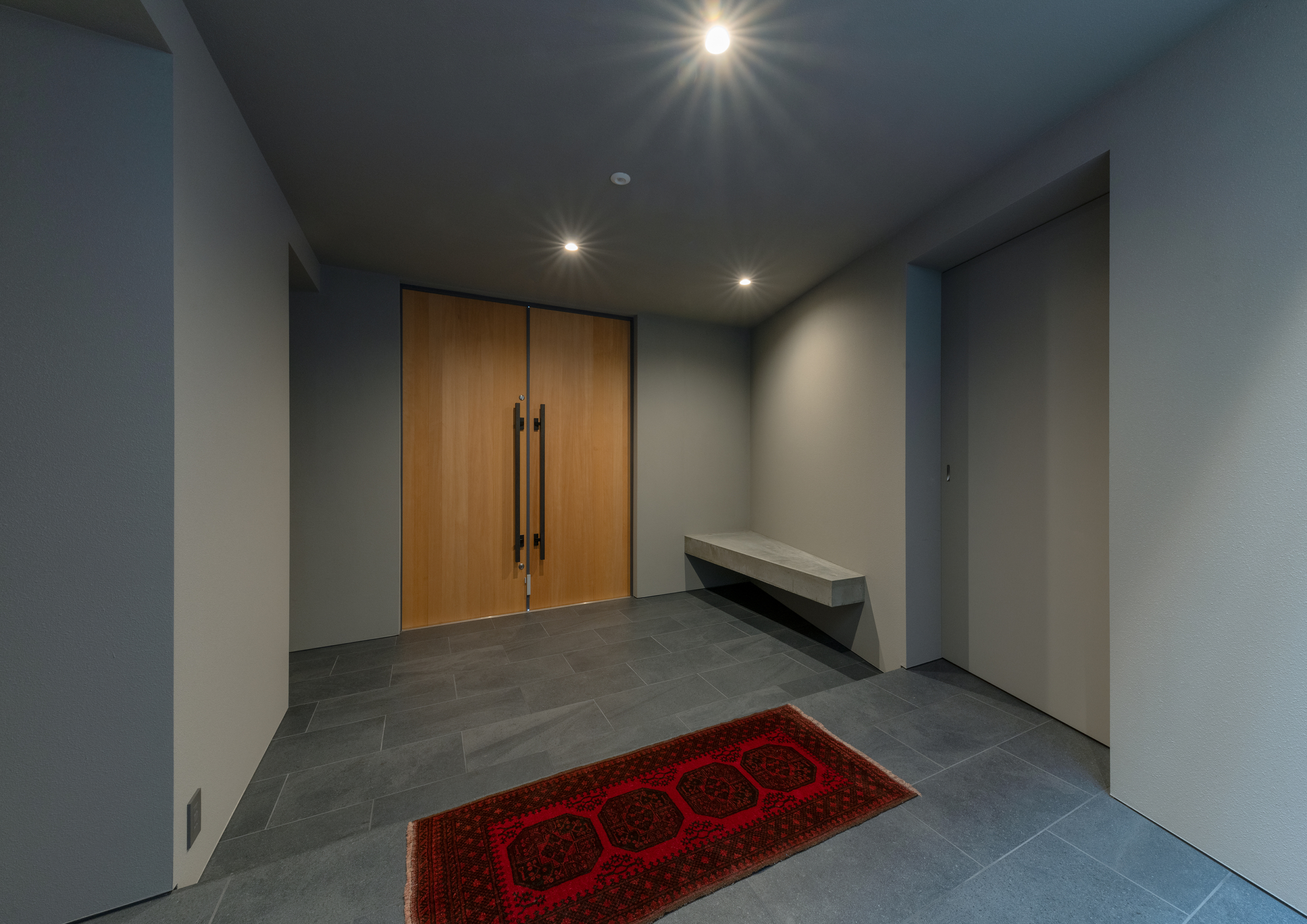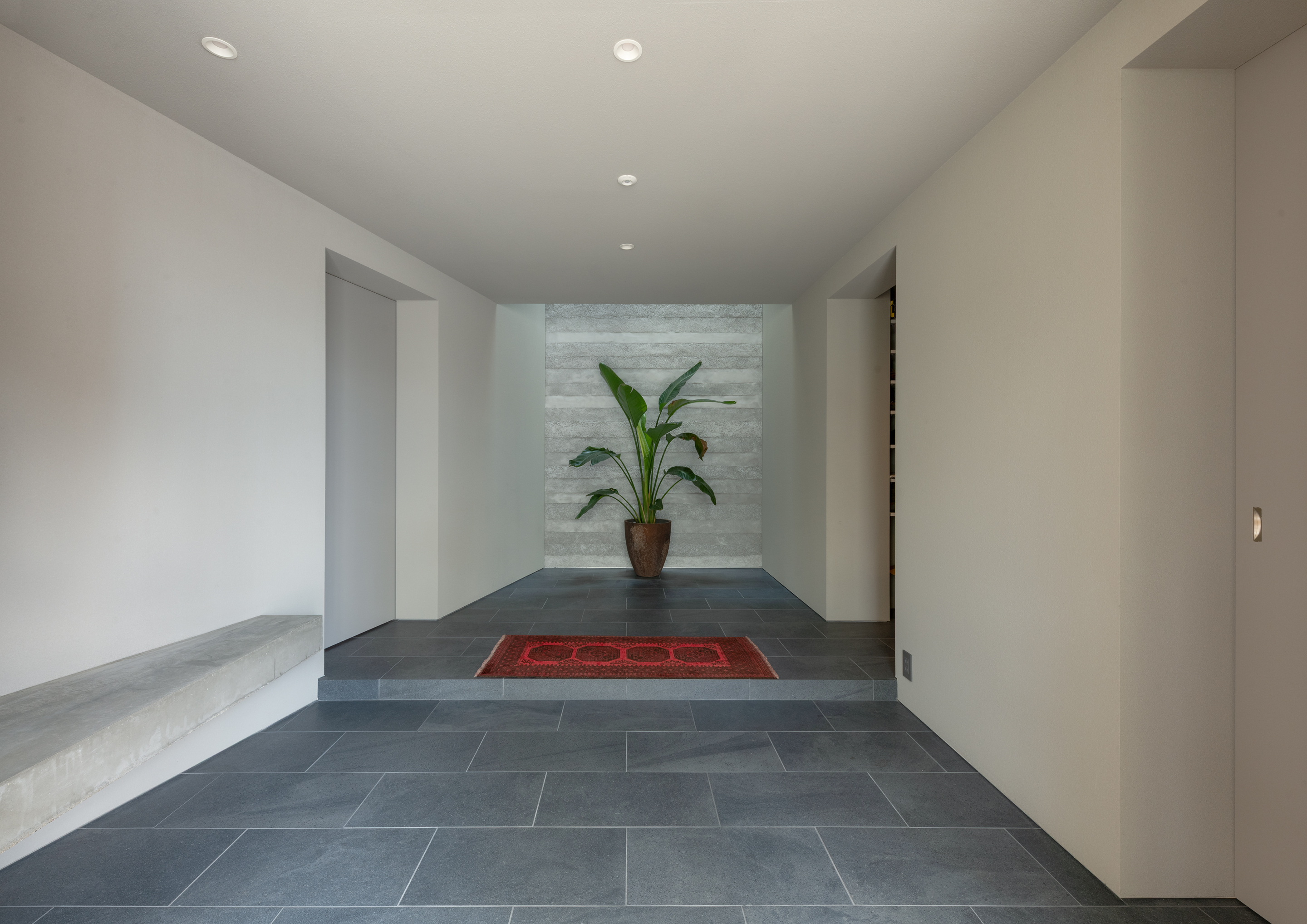 高低差のある敷地に計画されたこの住まいは、都市の喧騒から距離をおいた“静の空間”を目指して設計されました。