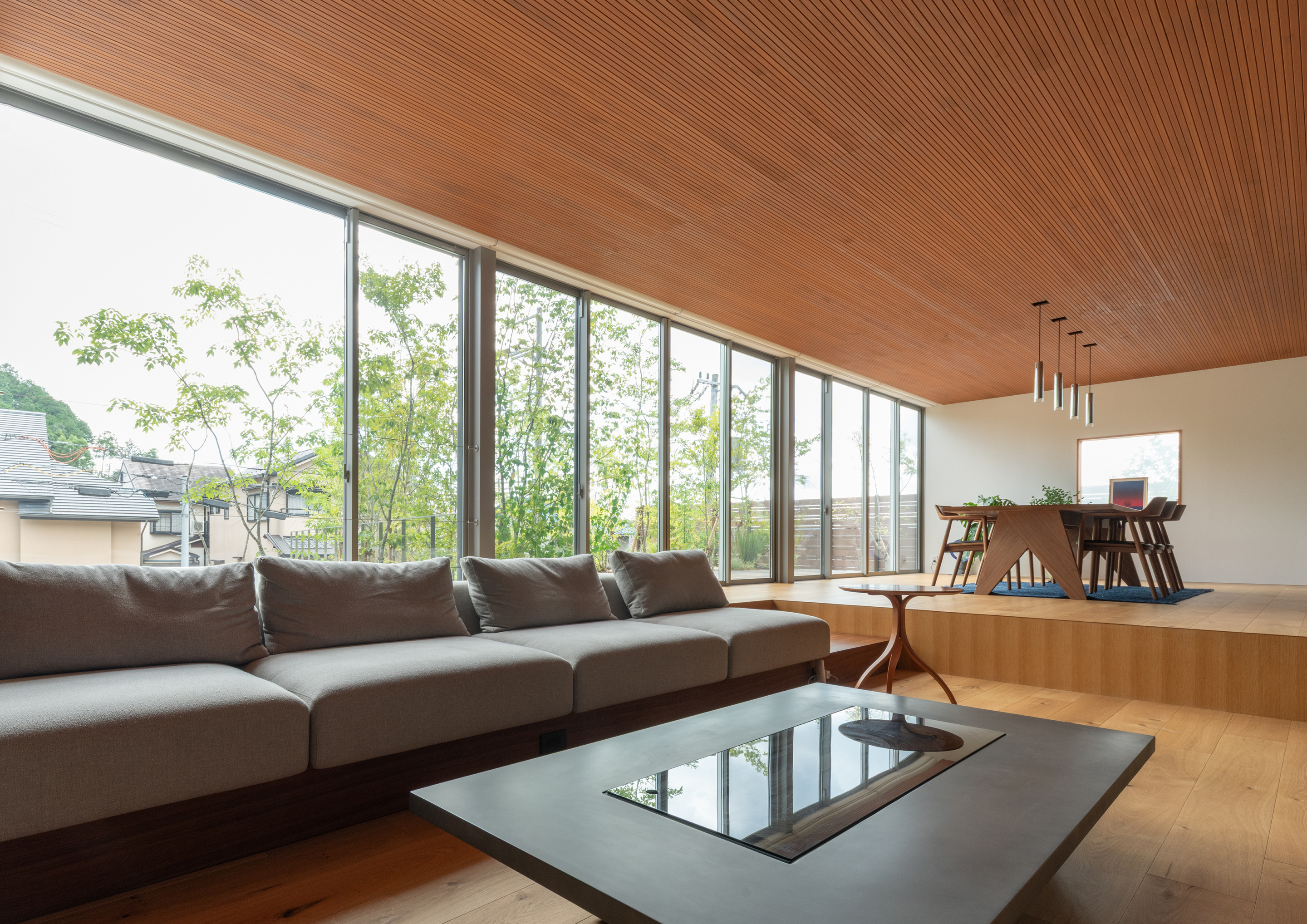 道路側からは閉じ、内に入ると大開口越しに豊かな緑と光が広がる構成。外部に対しては堅牢なRCの壁でプライバシーを守りつつ、内部では木の質感と自然光が穏やかに包み込みます。
