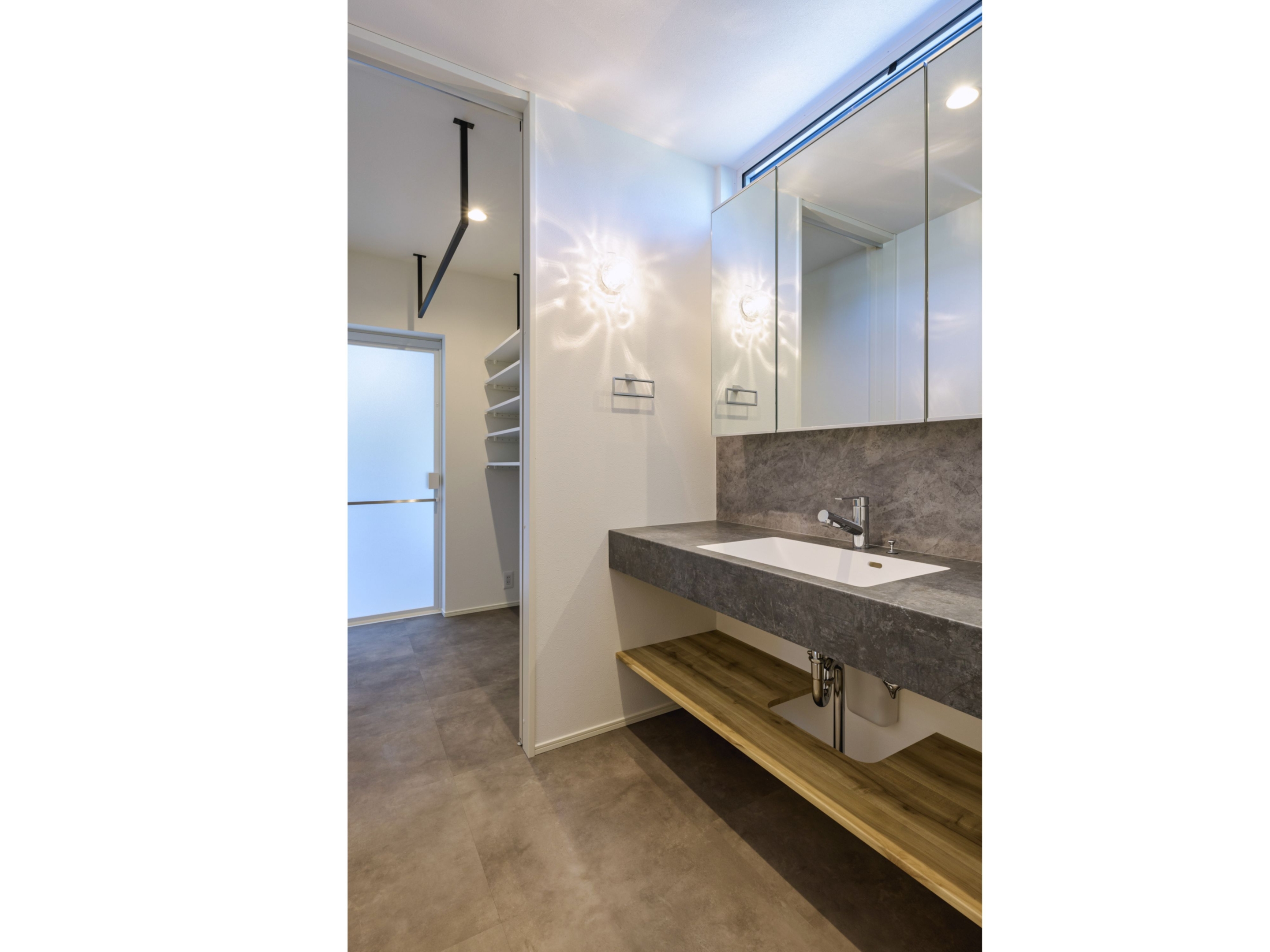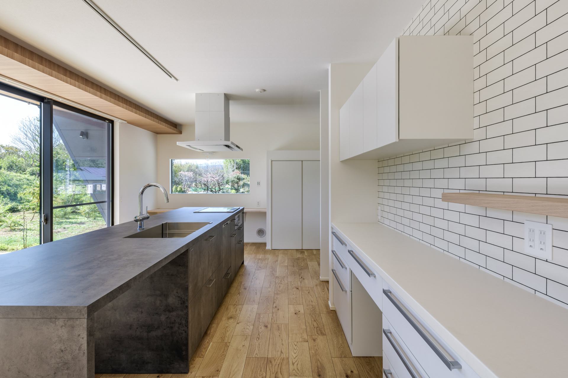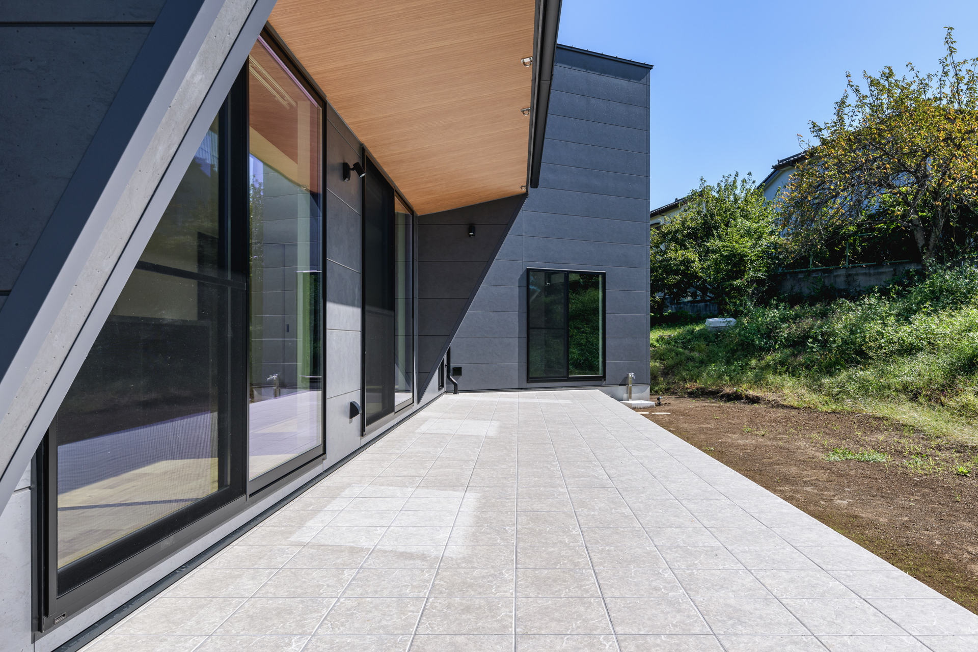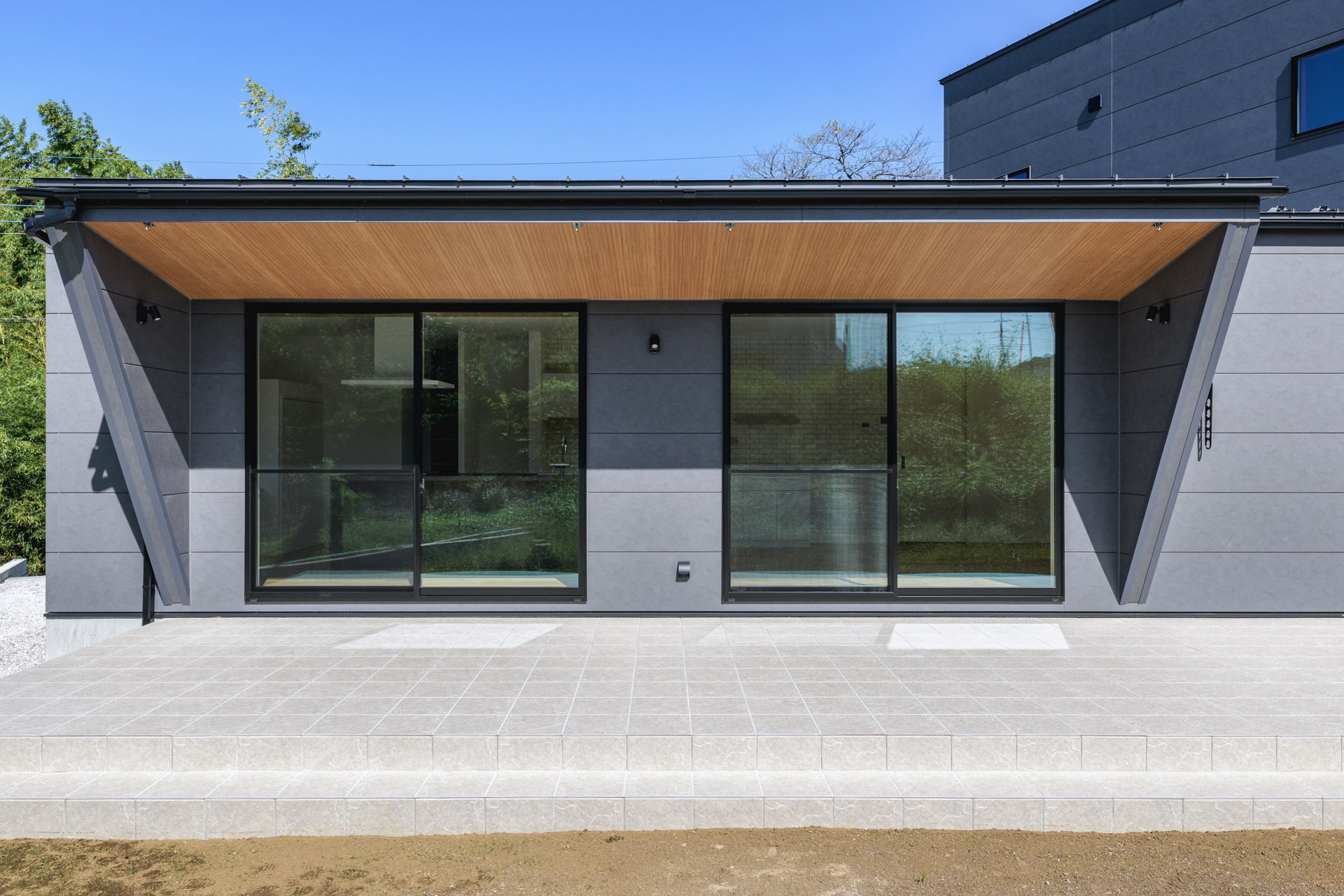 ダークグレーの外壁と木目が調和するモダンな佇まい。一歩室内に入ると、外観とのコントラストが際立つ、明るく開放的な大空間が広がります。ワイドな窓の先には広大なテラスと庭が広がり、LDKと一体化した贅沢な空間を生み出します。石目調のアイランドキッチンやスケルトン階段など、デザイン性と機能性を高めたこだわりのディテールが、日常を豊かに彩る上質な住まいです。