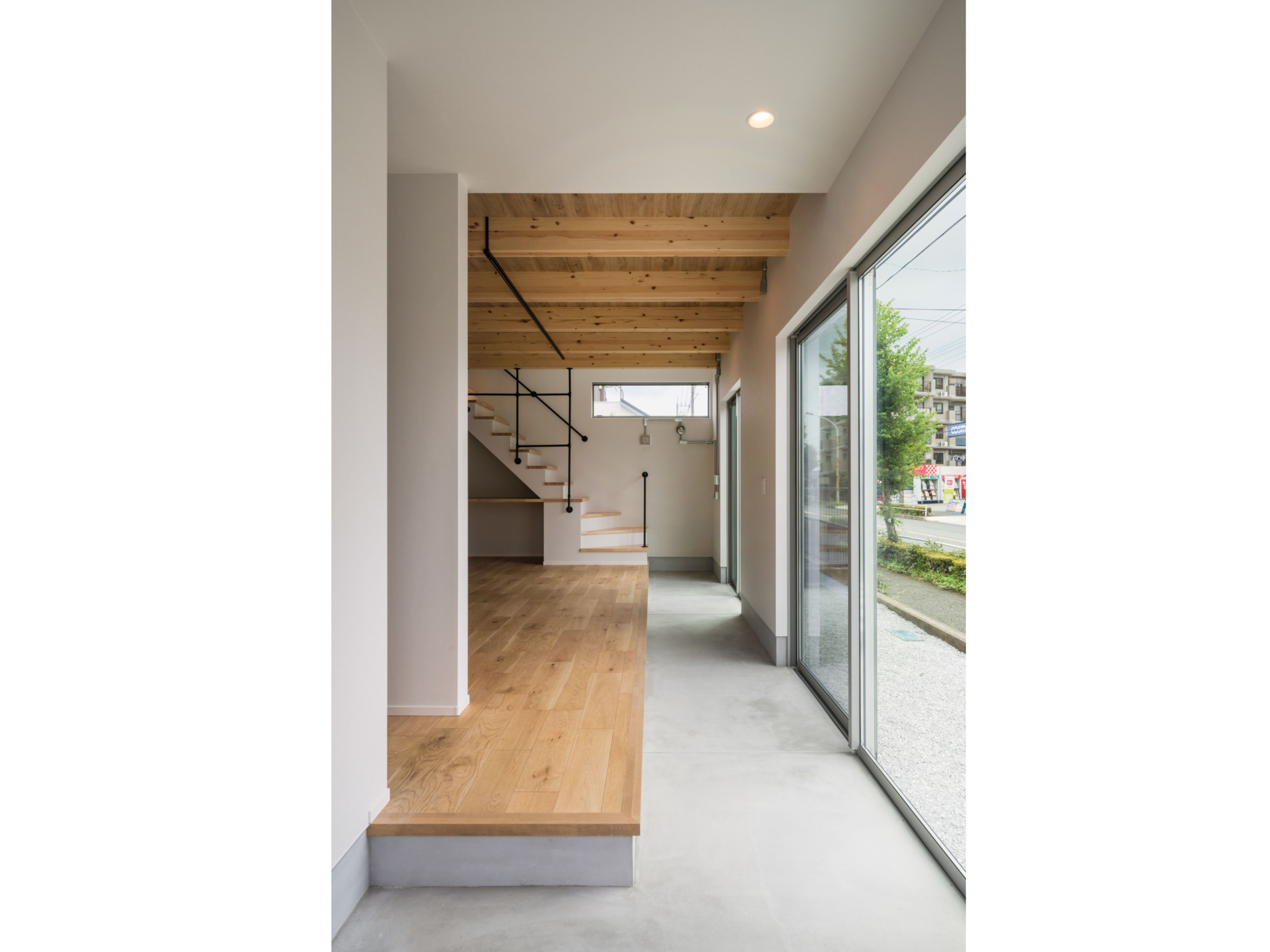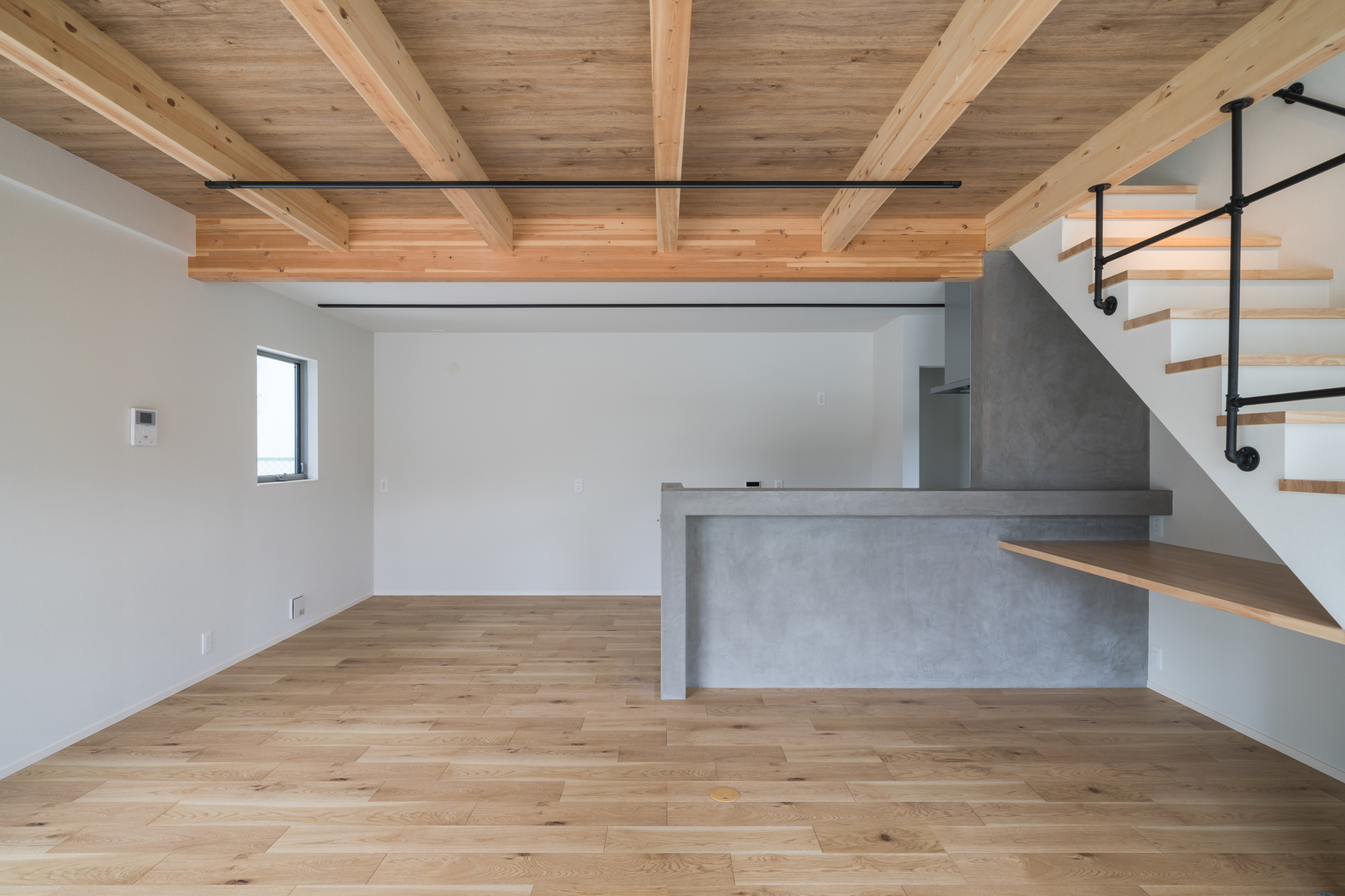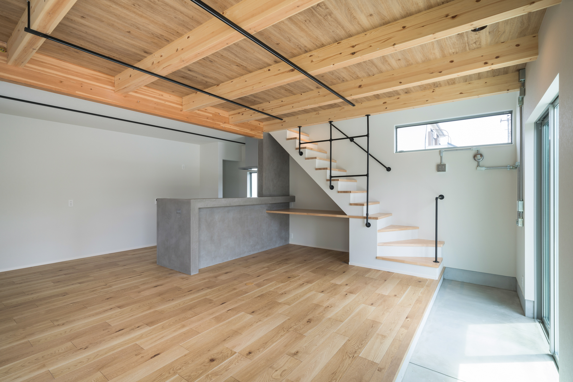 土間と吹抜けで広がる、開放的なモルタル&ウッドハウス