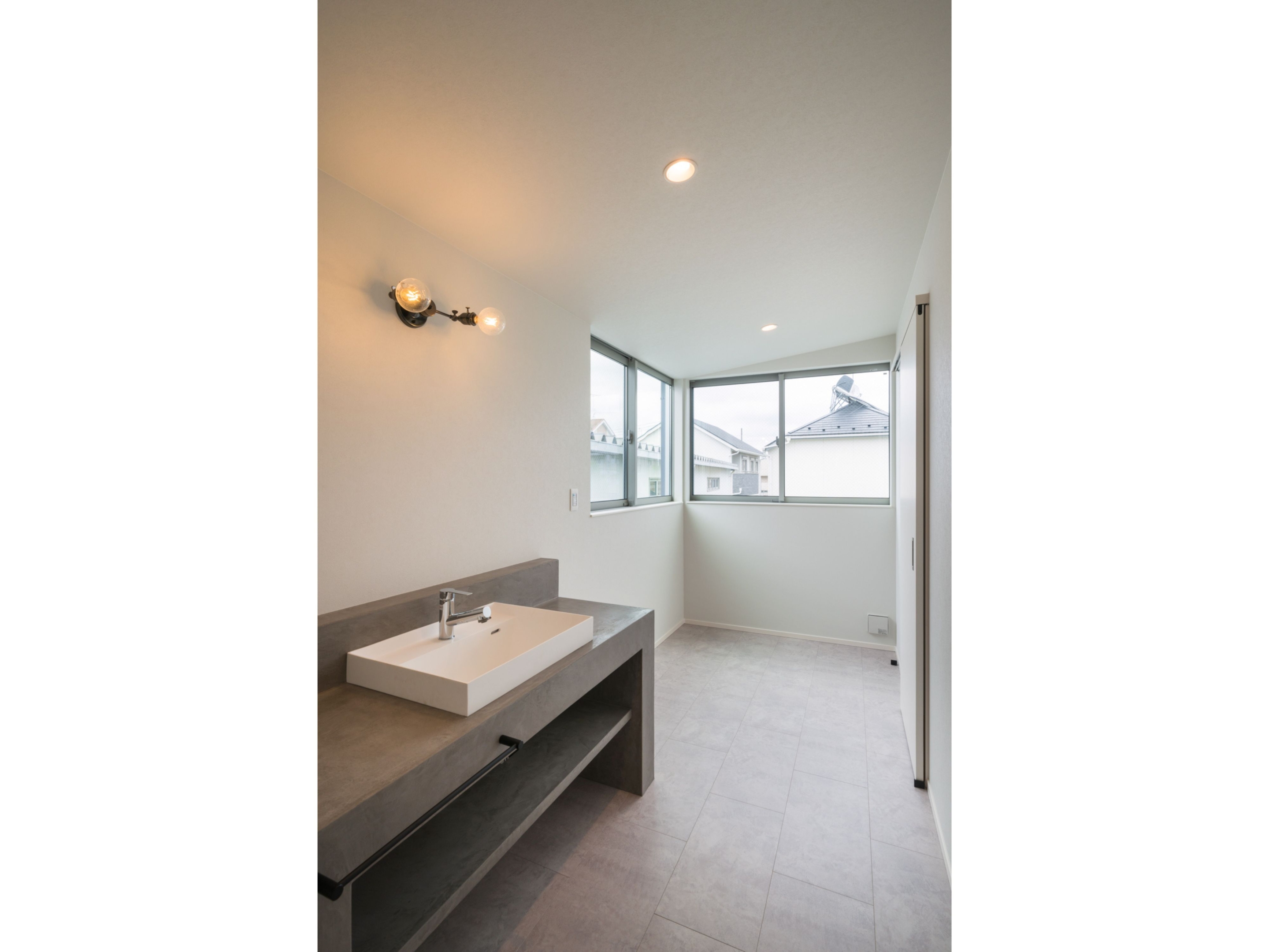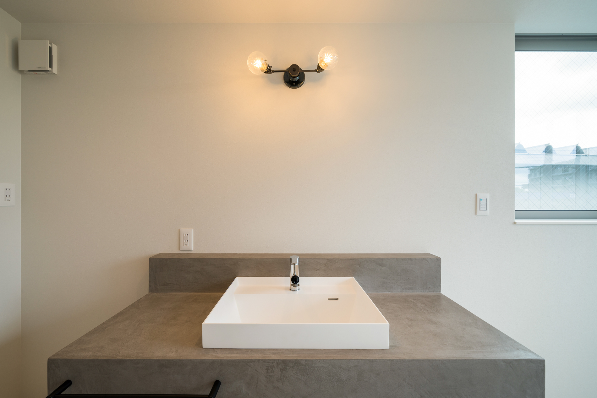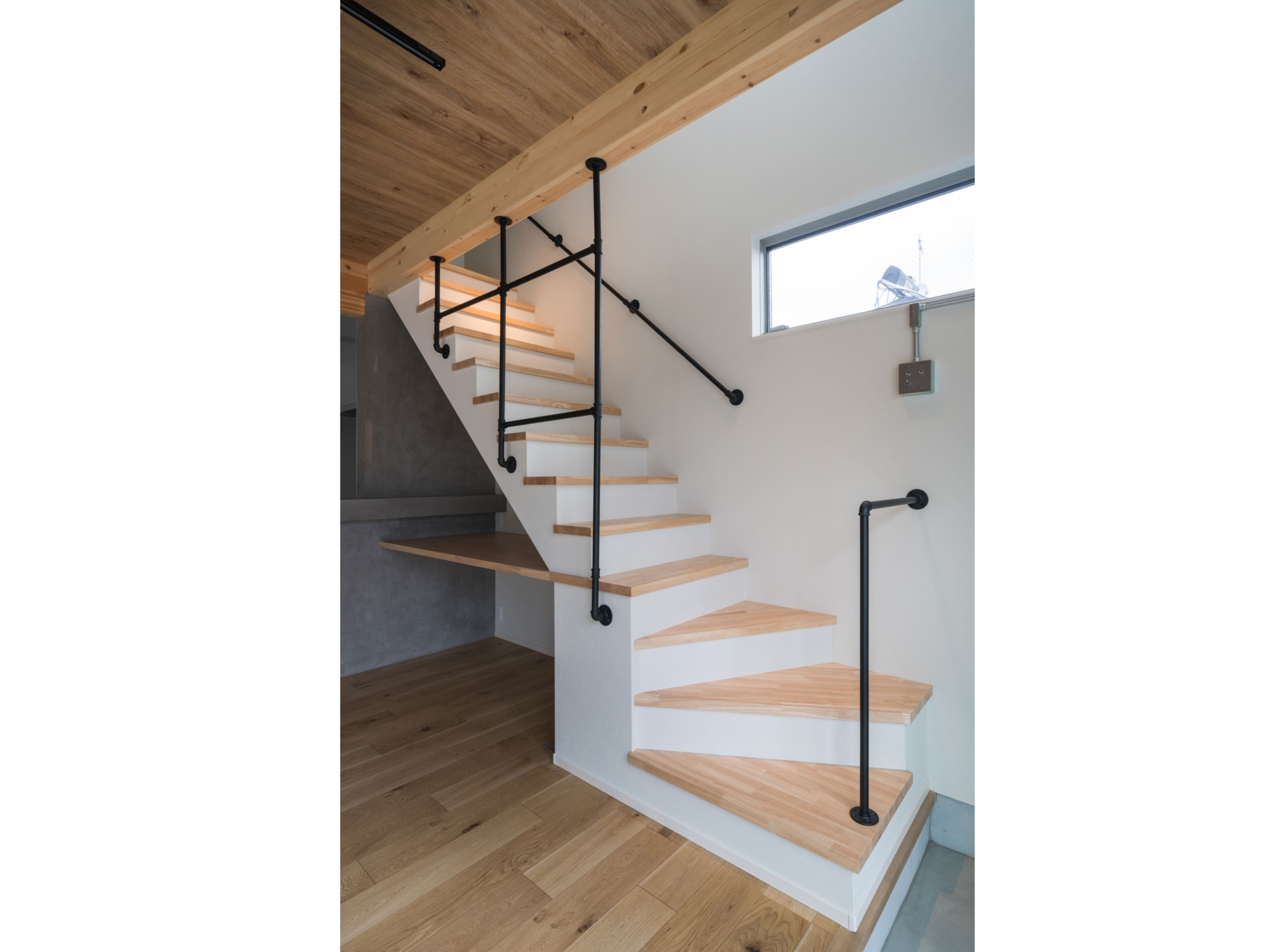 キッチンカウンターや洗面台にはモルタル調の素材を取り入れ、アイアンパイプのスケルトン階段や露出配管といった工業的な要素をプラス。自然の優しさと、洗練された無骨さが交差するデザインは、住まう人の個性を引き立てます。