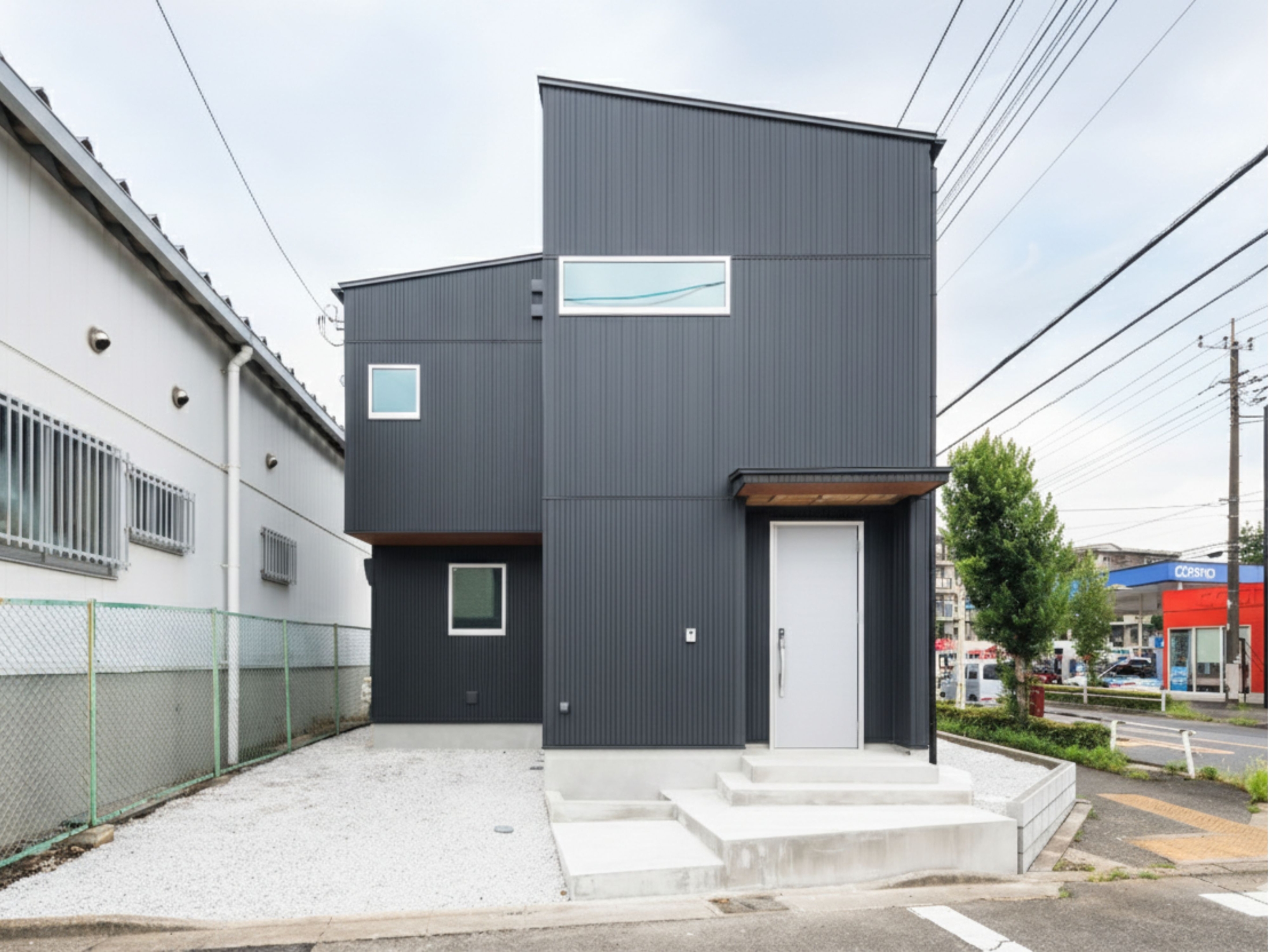「黒」のガルバリウム鋼板に包まれたモダンな外観とは対照的に、一歩足を踏み入れると広がるのは、自然素材と無機質な素材が見事に調和した開放的な空間です。