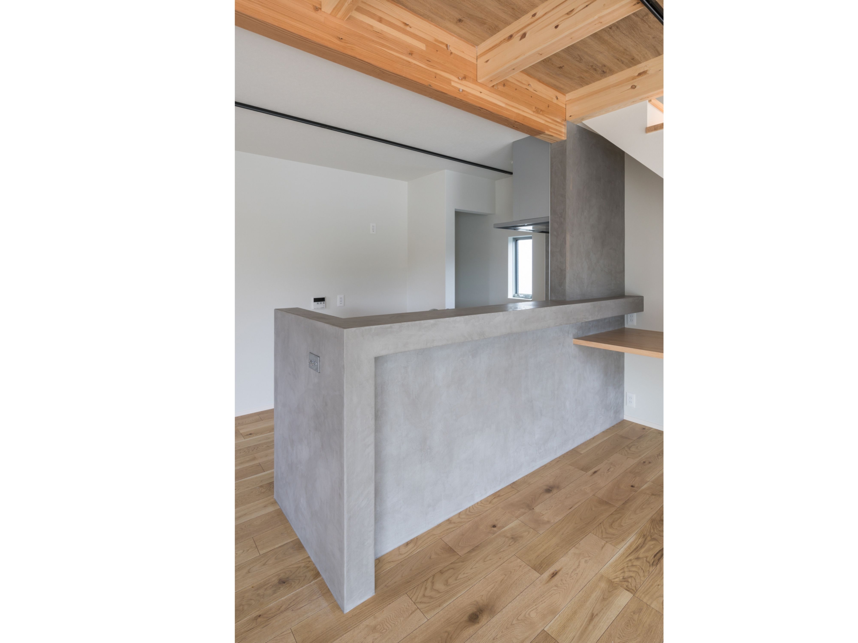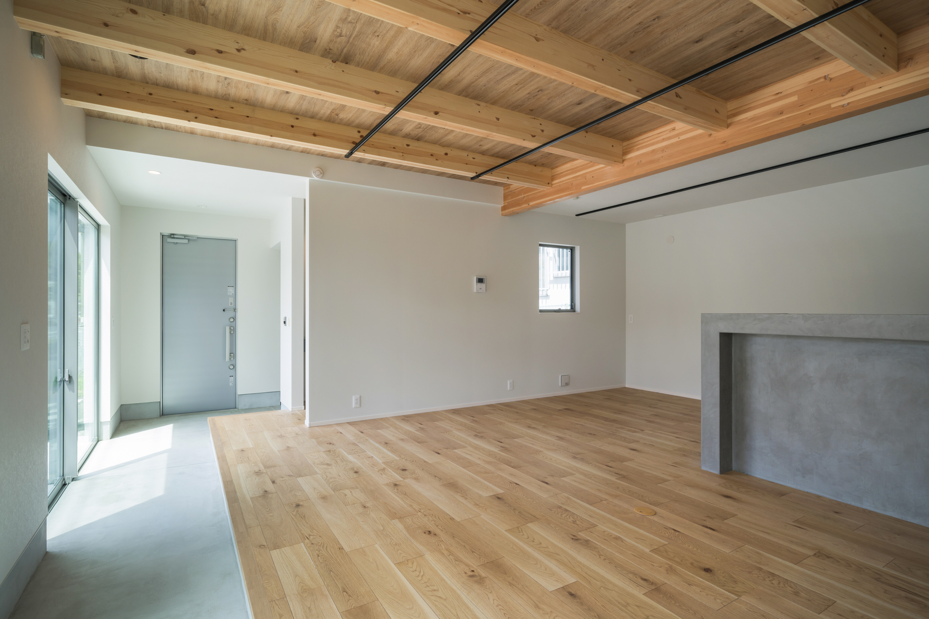 吹き抜けのように高い天井には、美しい木組みの梁と羽目板がダイナミックに広がり、空間に温もりと奥行きを与えます。その足元には、オークの無垢フローリングが心地よく、一部には店舗のようなクールな土間空間を採用。