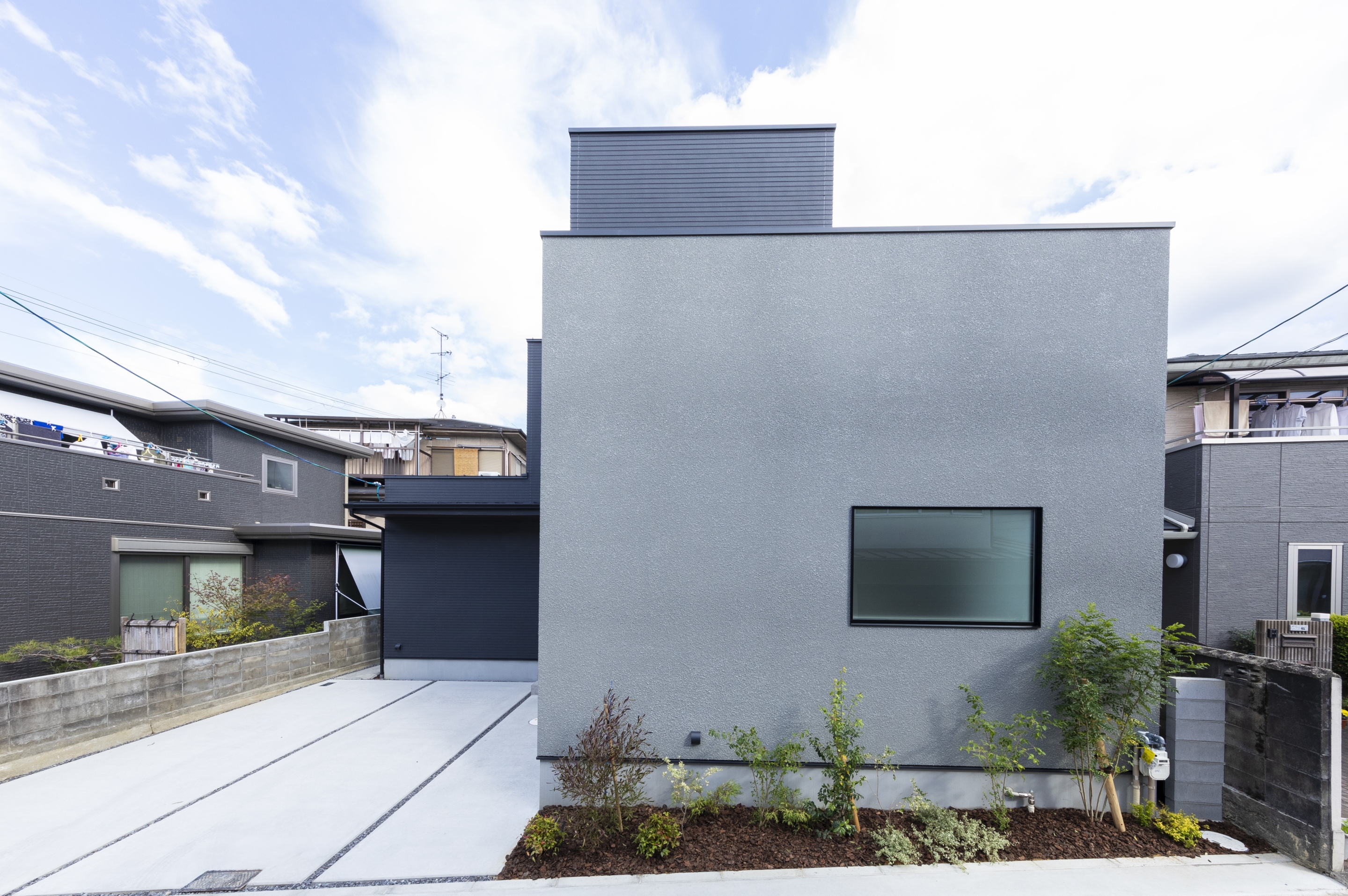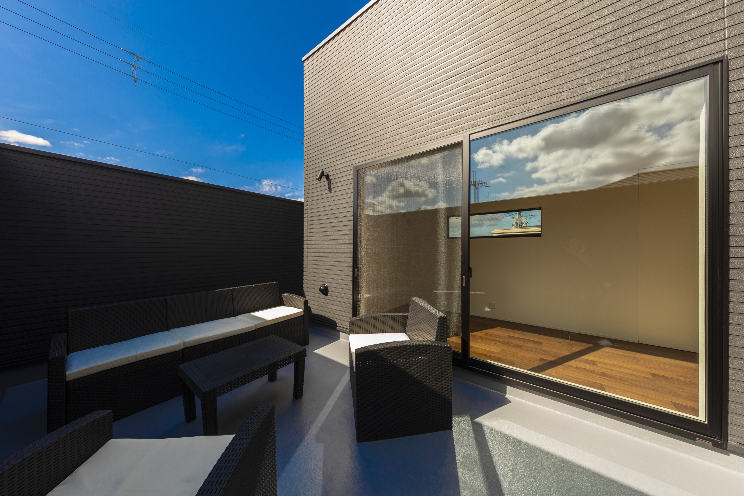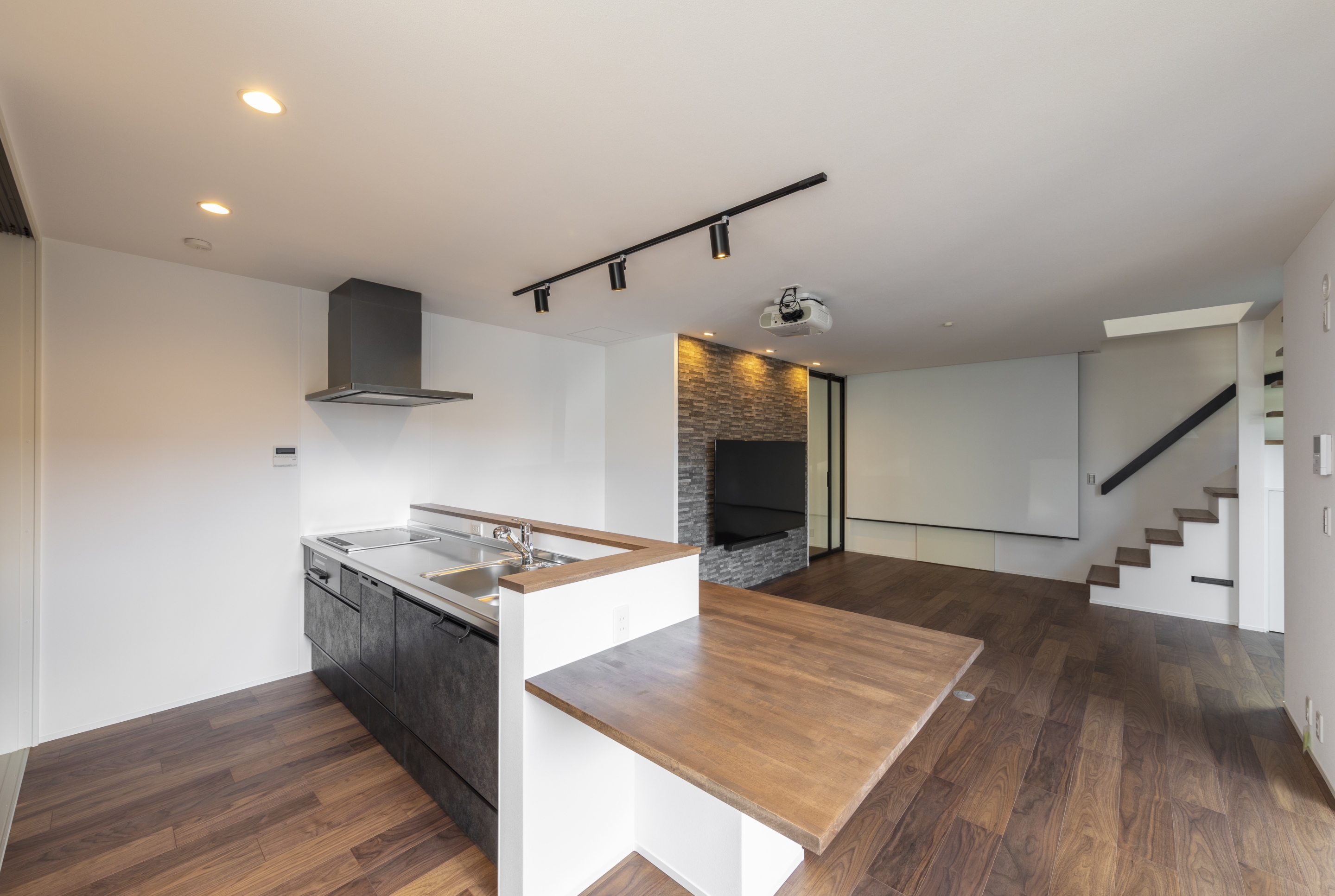 ダークトーンのツートンカラーが印象的な、都会的で洗練された外観。室内に入ると、広々としたLDKにはプロジェクターと石目調のアクセントウォールが設置され、まるで映画館のような贅沢な空間が広がります。この家最大の魅力は、青空の下でBBQや日光浴が楽しめる開放的な屋上テラス。毎日の生活動線を考慮した機能的な間取りの中に、非日常の楽しみを取り込み、家族の理想を叶えた住まいです。