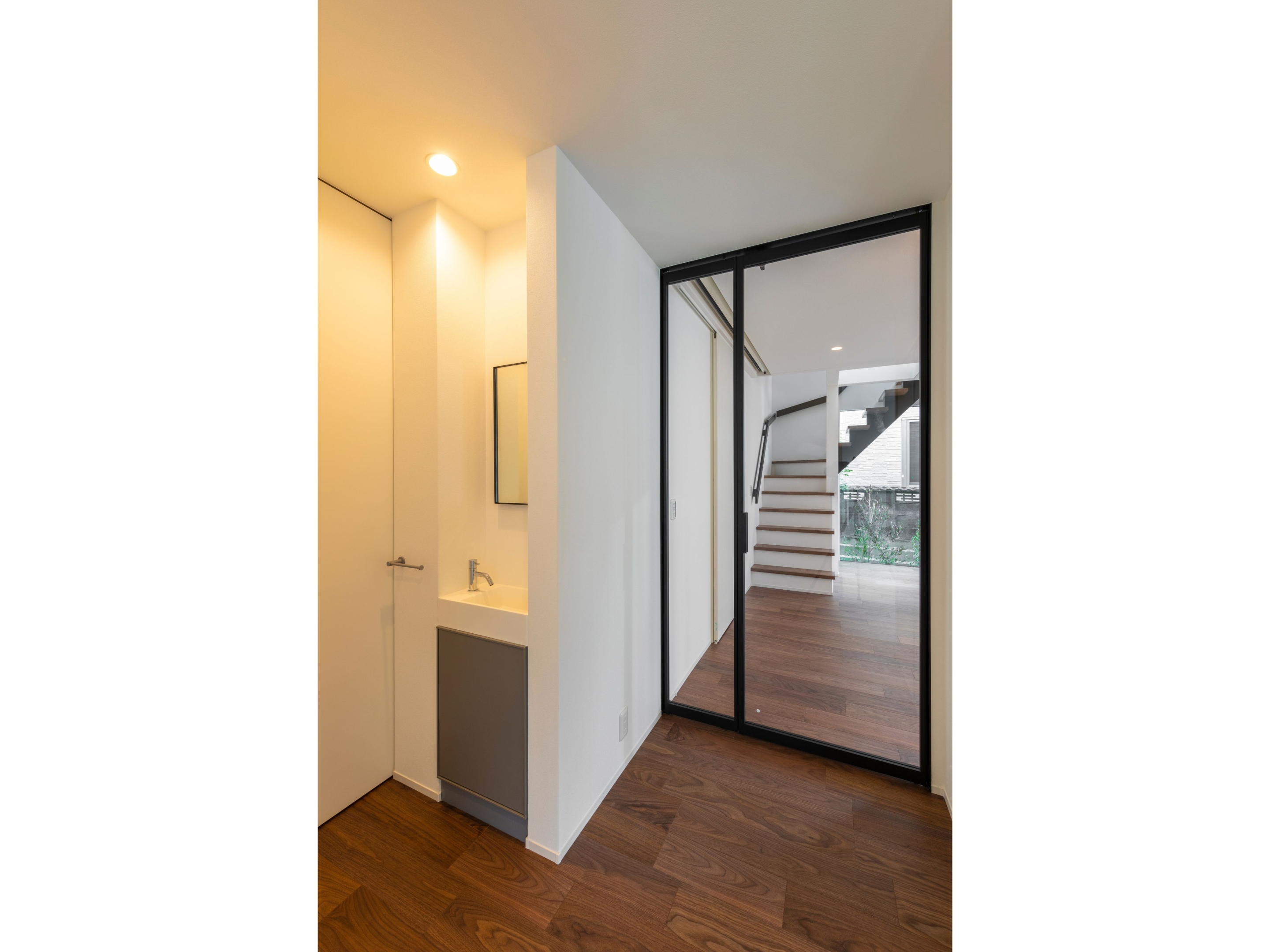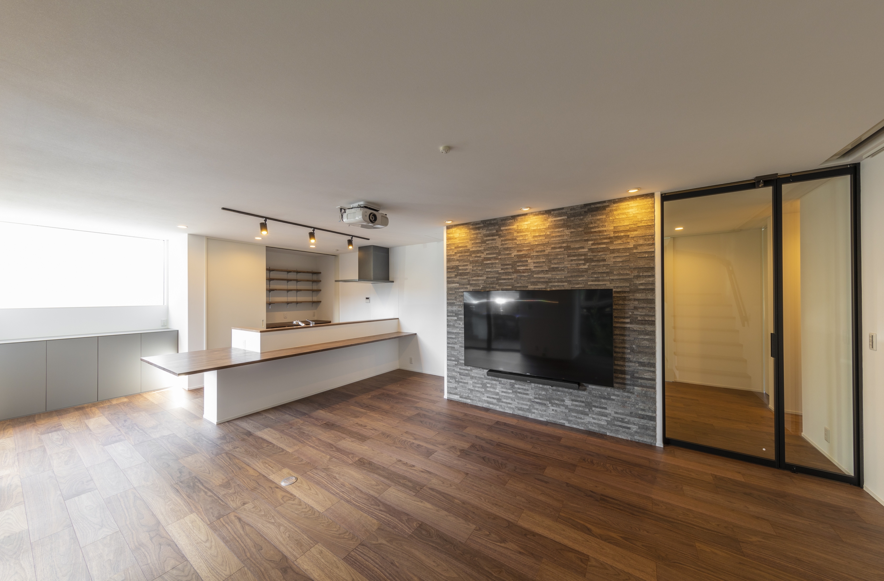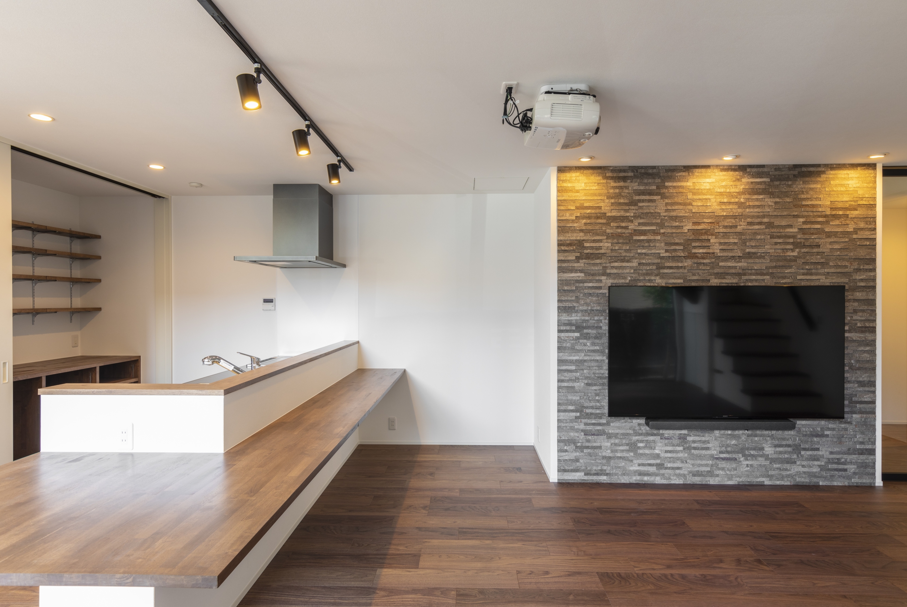 ダークトーンのツートンカラーが印象的な、都会的で洗練された外観。室内に入ると、広々としたLDKにはプロジェクターと石目調のアクセントウォールが設置され、まるで映画館のような贅沢な空間が広がります。この家最大の魅力は、青空の下でBBQや日光浴が楽しめる開放的な屋上テラス。毎日の生活動線を考慮した機能的な間取りの中に、非日常の楽しみを取り込み、家族の理想を叶えた住まいです。