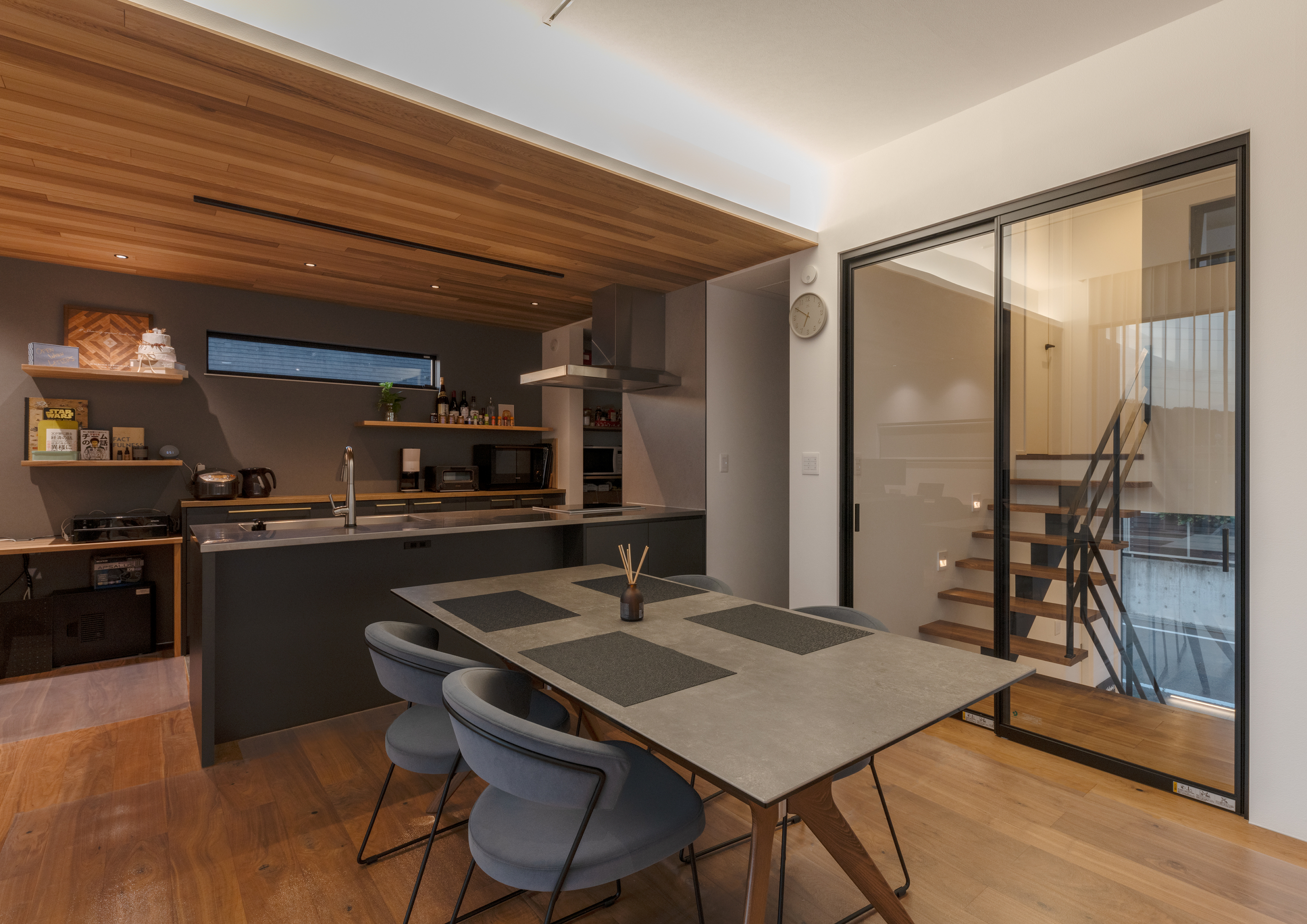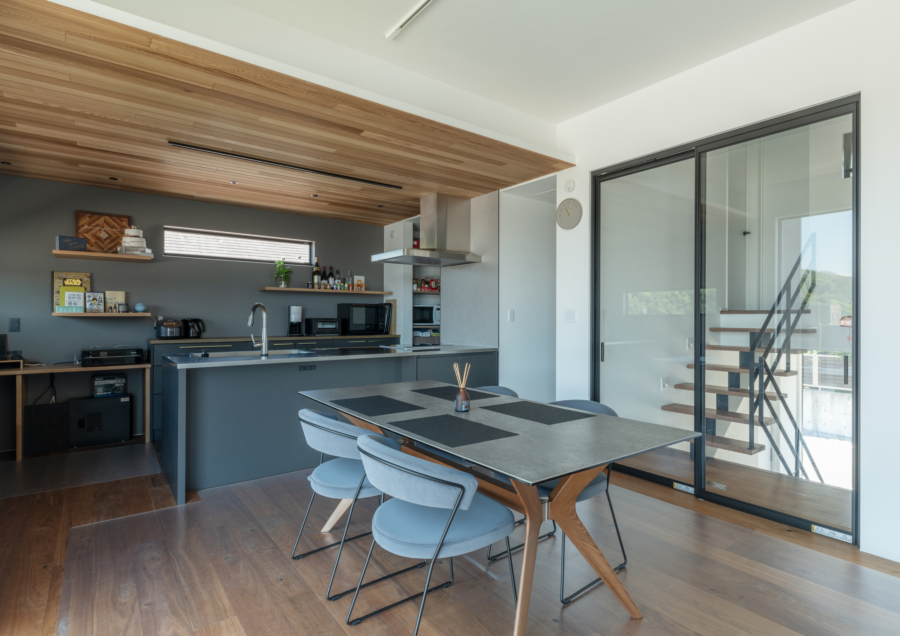天井の木貼りとグレーのキッチンが落ち着いたトーンを生み出す。