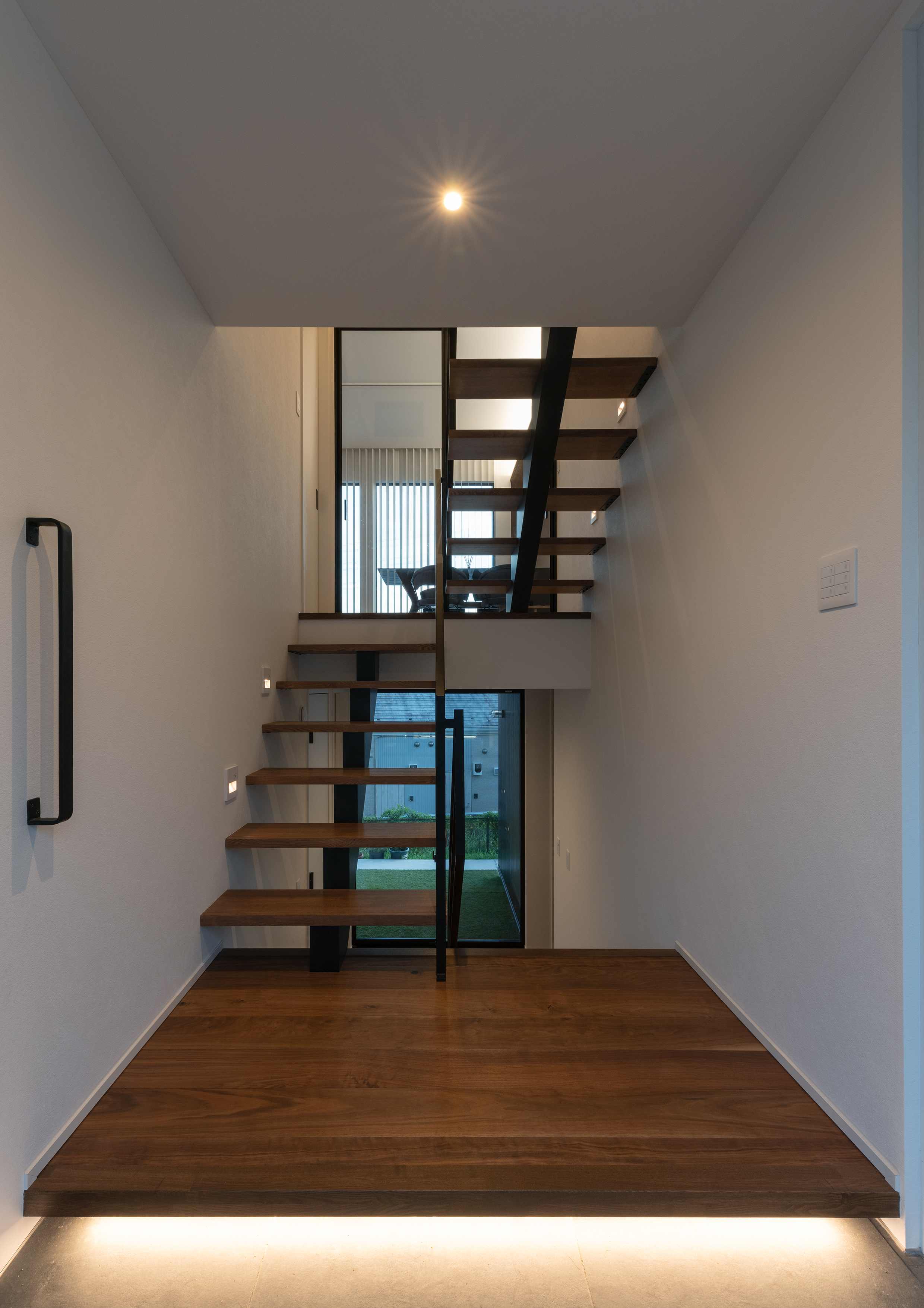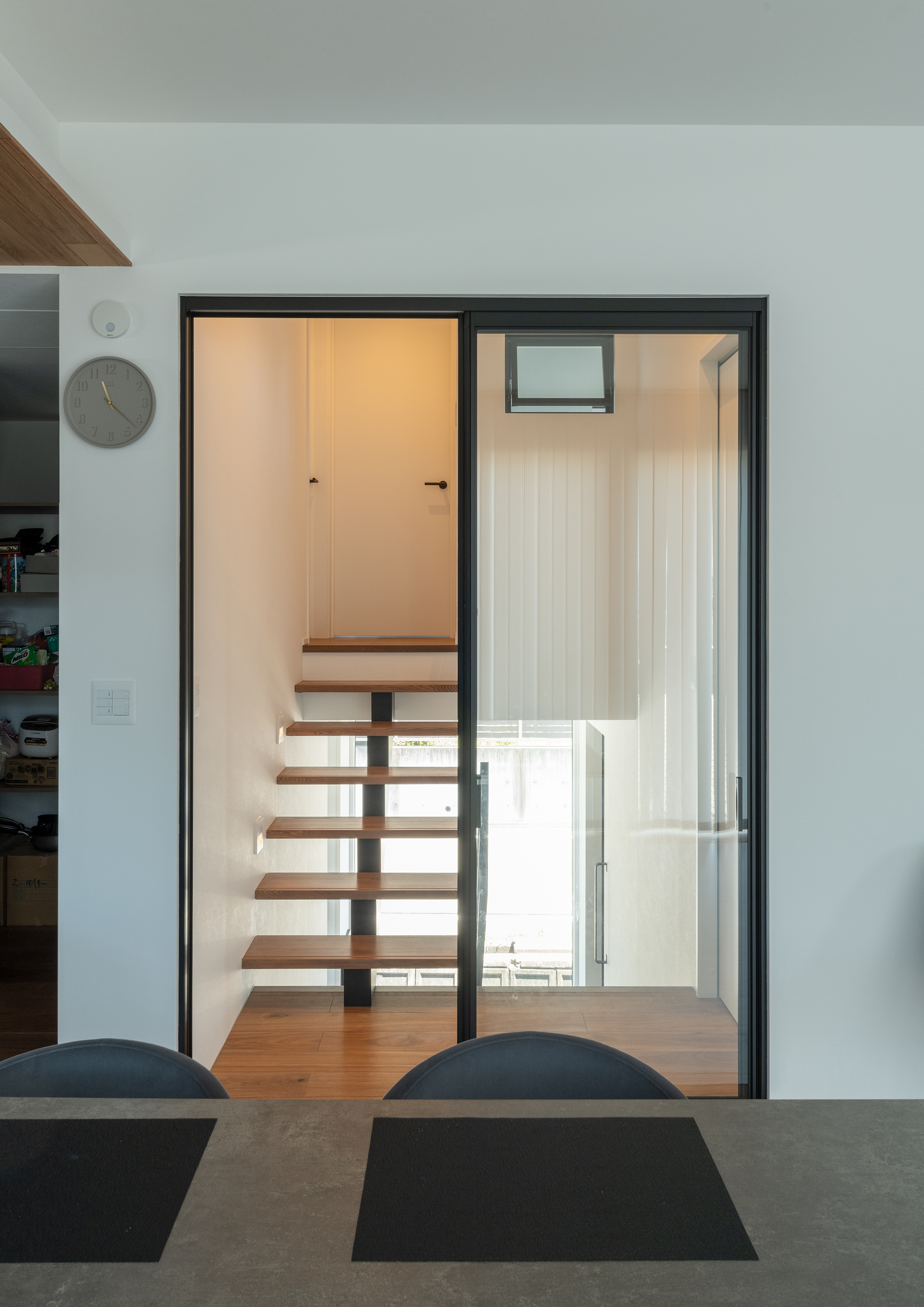 吹抜けとストリップ階段により、上下階をゆるやかにつなぐ動線。