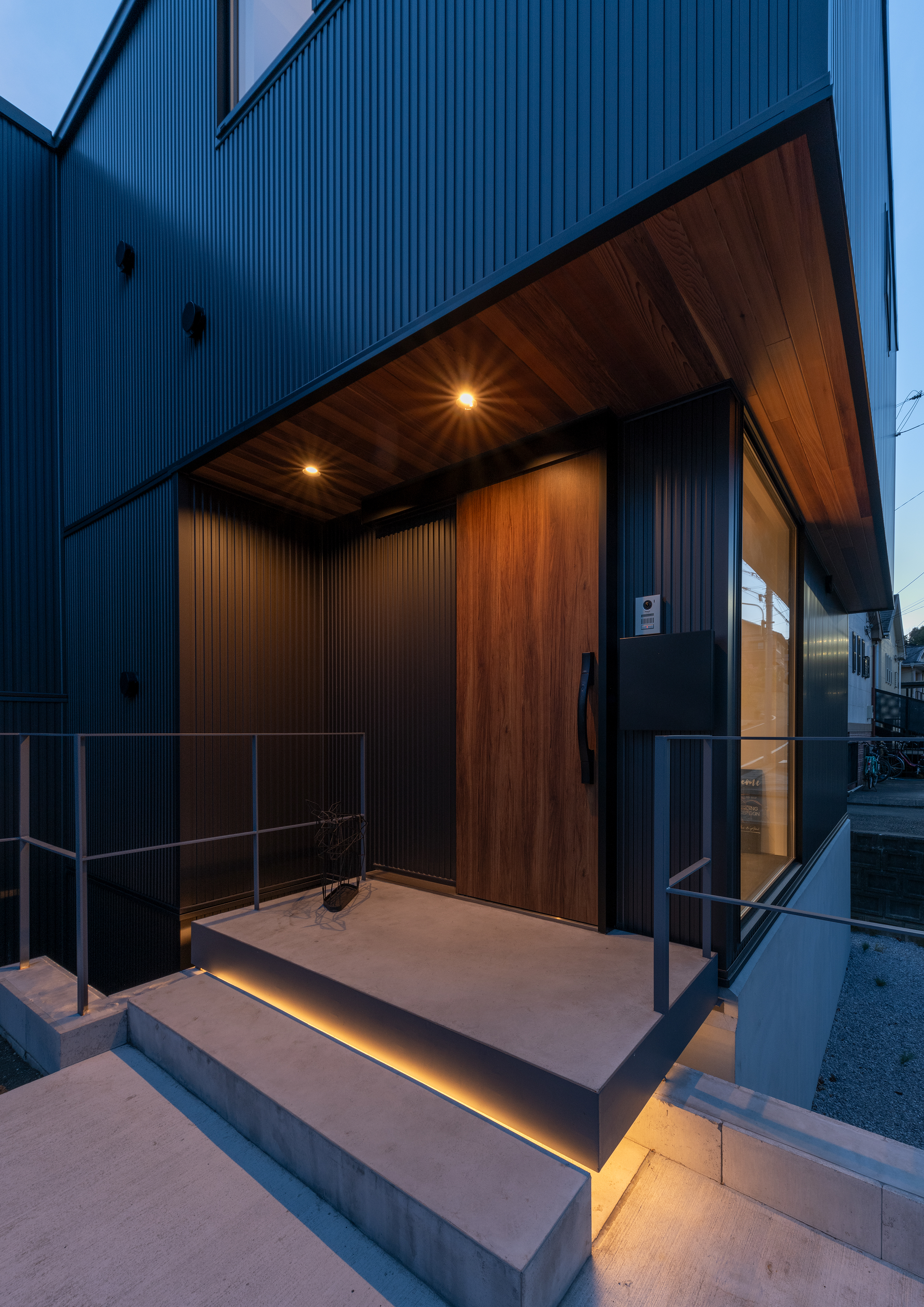 黒い外壁に浮かび上がる木目の扉が、静謐な佇まいを際立たせる。
