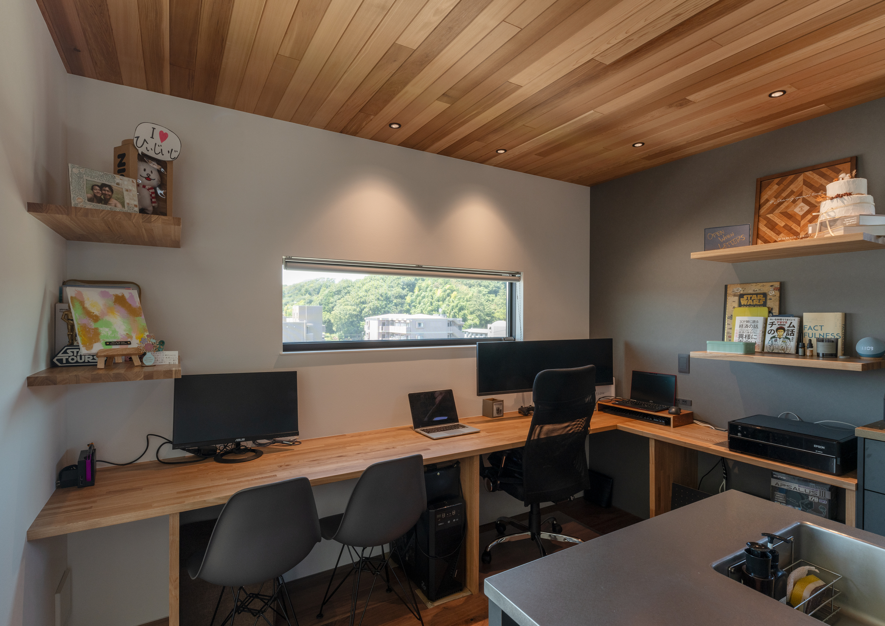L字型カウンターと造作棚で、在宅ワークにも対応した快適な環境。